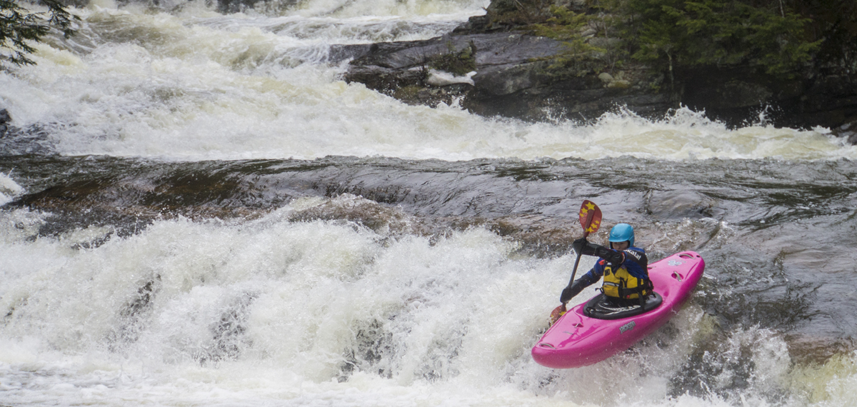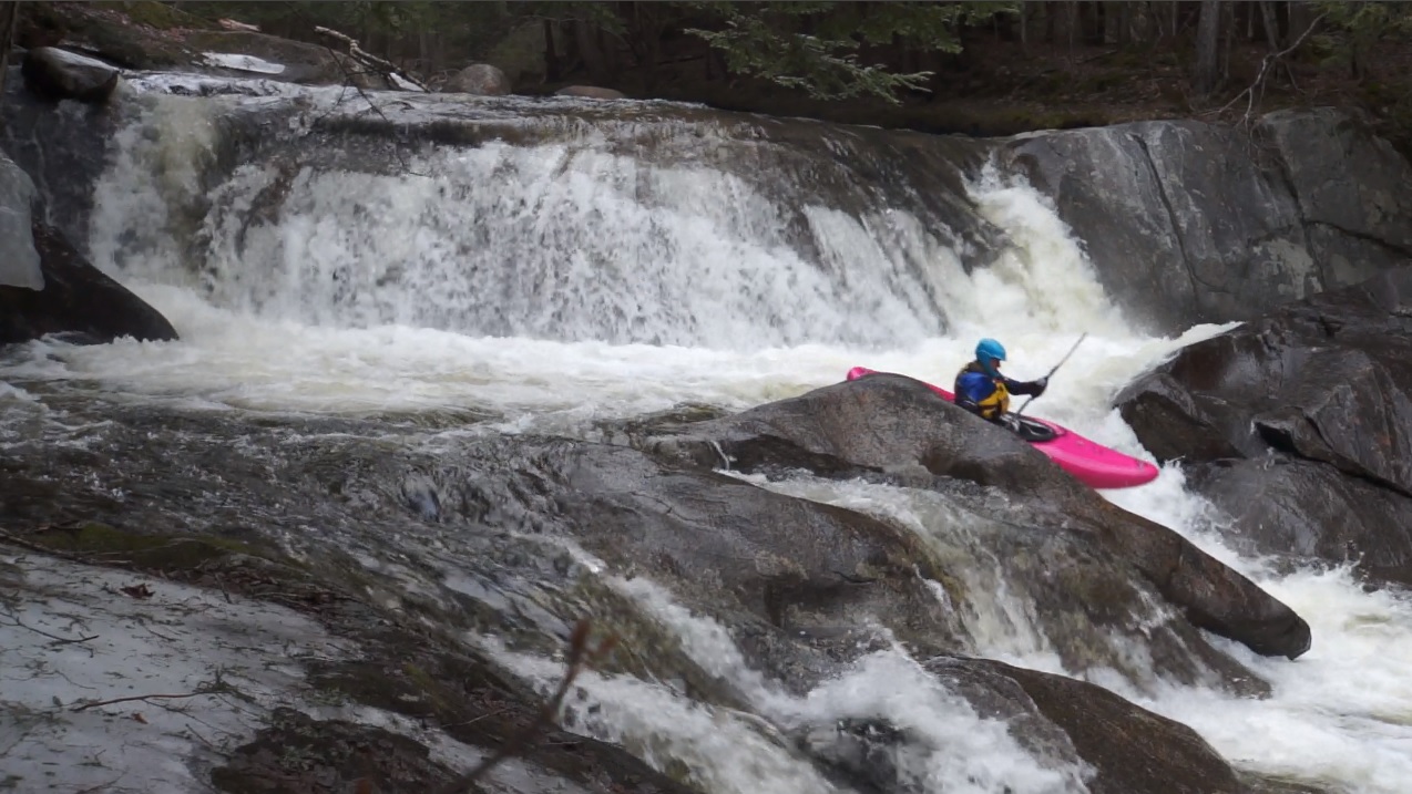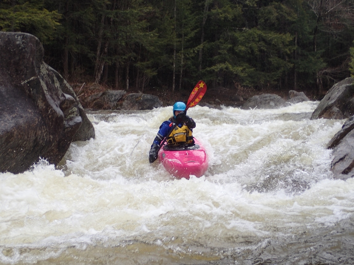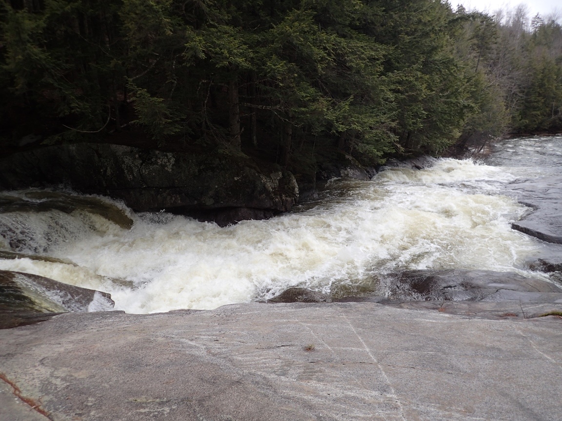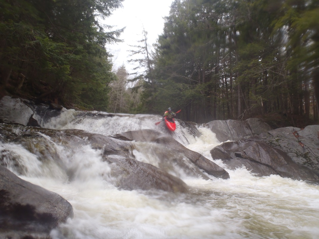 The run was mostly nice. Putting in on Rocky Brook we were experienced some low water, manky, boat bashing with two nice rapids. The first of which could of used twice the water to make it cleaner as Diane reached in and found a piton. Once past the confluence we were on a full sized river and quickly came to Cannibal Falls. The pictures of the falls that I have seen are all much lower water and quickly our hopes of running it faded as we saw the extremely pushy lead in doing everything in its might to move you to the a massive piton at the right side of the base of the falls. Maybe it goes well, but having never seen video of someone running it we opted to portage. Downstream the rivers turns into boulder gardens that climax just before and after the bridge on N. Dorchester Rd. This then leads you to the big slide which is relatively easy, but very picturesque. Downstream it is all boogie to take-out.