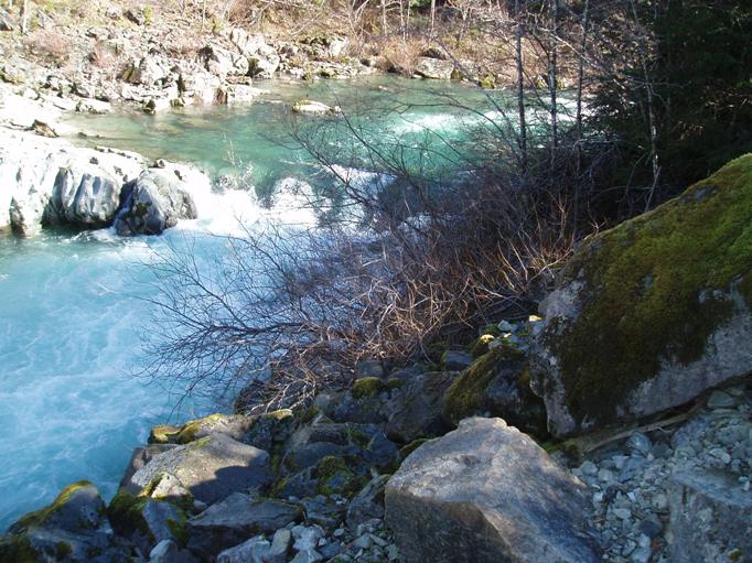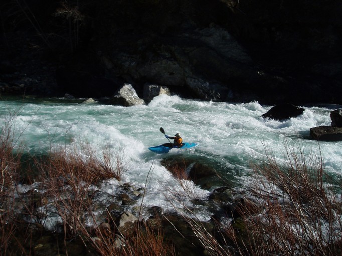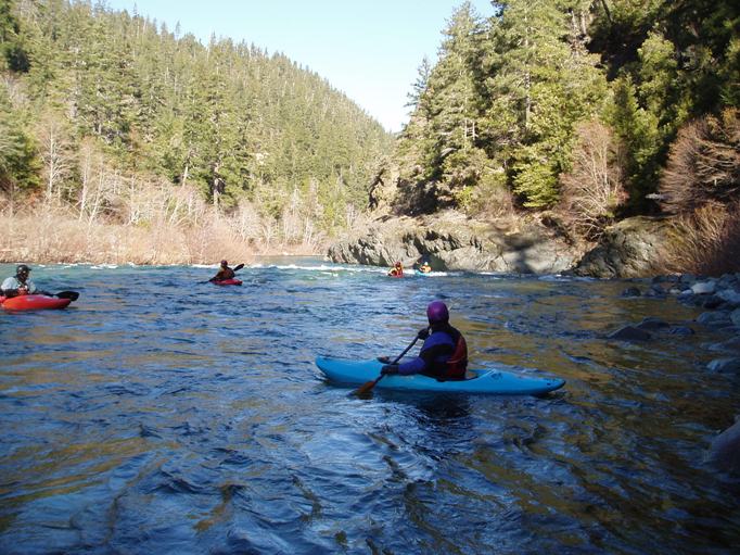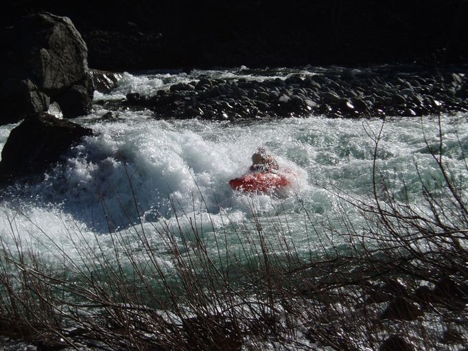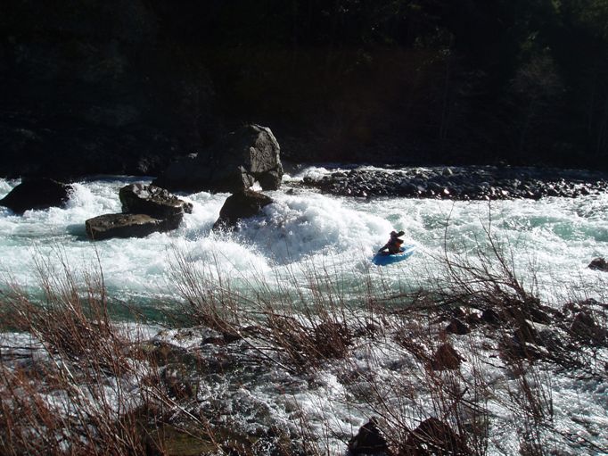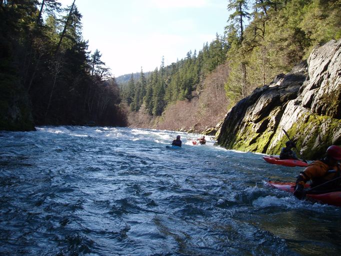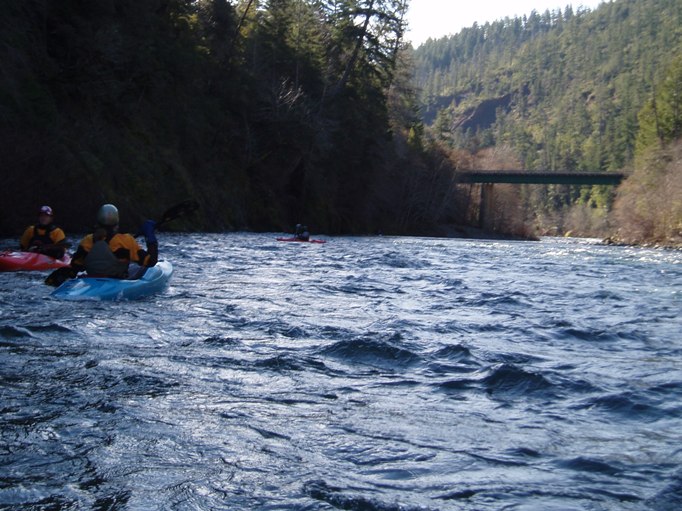 We ran this stretch of water over two days. The first day we got skunked on Goose Creek and after driving up and back setting different shuttles three times, we set ourselves on doing the lower half of the Lower South Fork of the Smith and then running the South Fork Gorge. The first day we decided to put in at the third bridge and run the five miles to the South Fork Gorge. These six miles were fun and took one hour with 2,000 cfs. In it are two harder rapids and one other stuck out. The hardest is just upstream of the gorge (take out) and can be road scouted. From Craig's Flat (or beach, I can't remember) drive about ΒΌ mile. The first sharp right turn that has a large turnout on the left signals you. Stop and find the trail at the downstream edge of the turnout, it is ~100 feet to the water level.