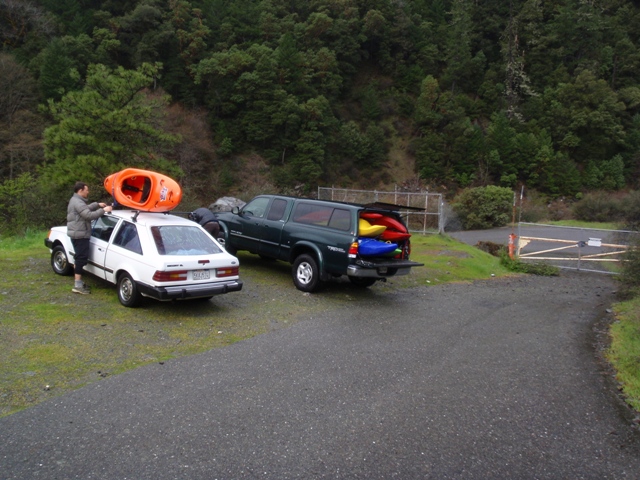 Put-in. Go back to South Fork Road and turn right. You come to another fork, one road goes left and high, the other right and low, go left and high. Continue until you come to a sign for "Tod's Ranch River Access," stay left (marked "Dead End"). After a little ways you come to another fork where again one road goes left and high, the other right and low. Stay right and low. This road ends up at a little circle, park here. There is a gravel road/path down the left side that leads to the river.