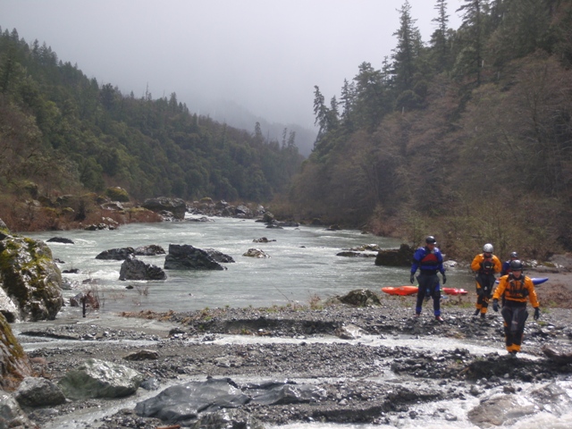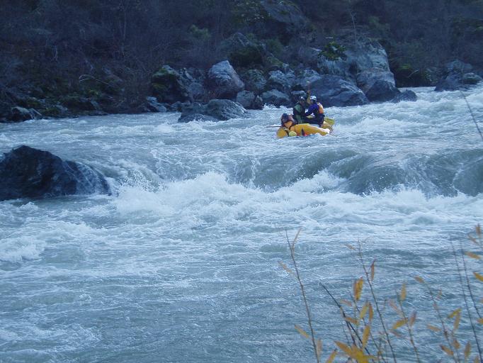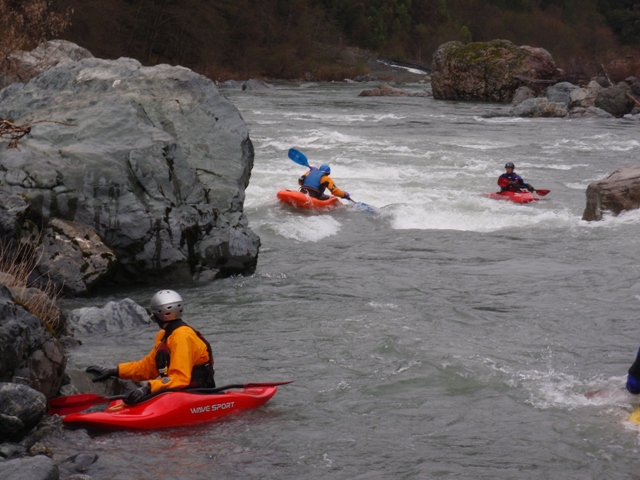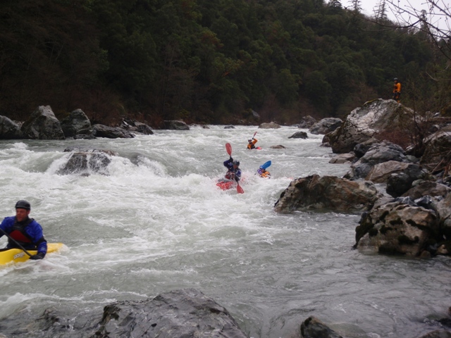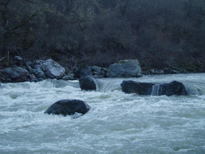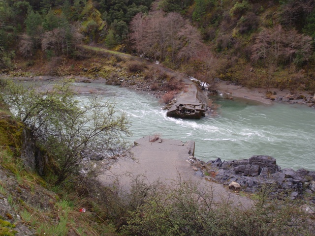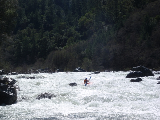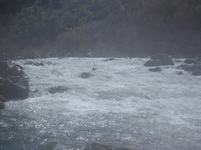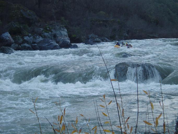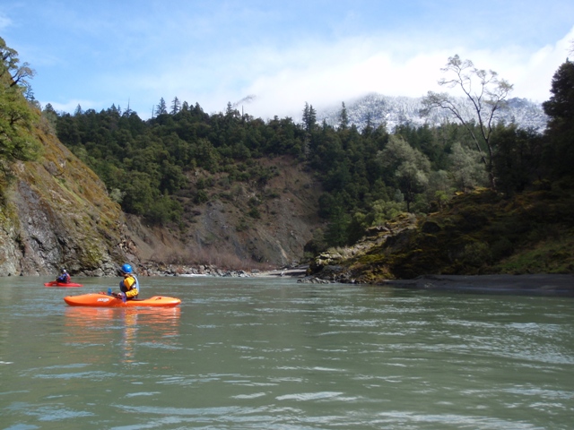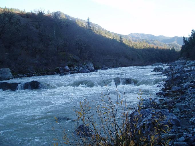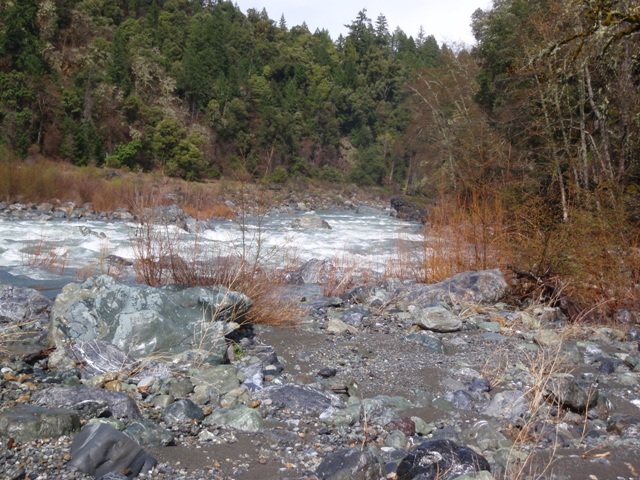 Finally, be aware that the gauge for this run is in Hyampom which is some 20 miles or something like that up river. The day we did this the gauge read 2,100 cfs or so, but at put in we all agreed it was at least 4,000 cfs or as much as 6,000 cfs. I have been told it can be done with the gauge reading up to 6,500 by kayaks, but for rafts the cut off is more around 4,000 for some, but 2,000 for the one rafting company that I know of that runs this stretch regularly.