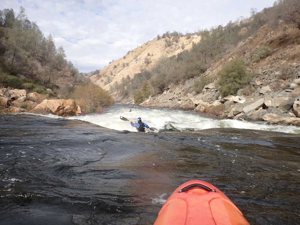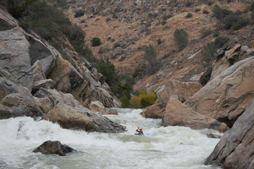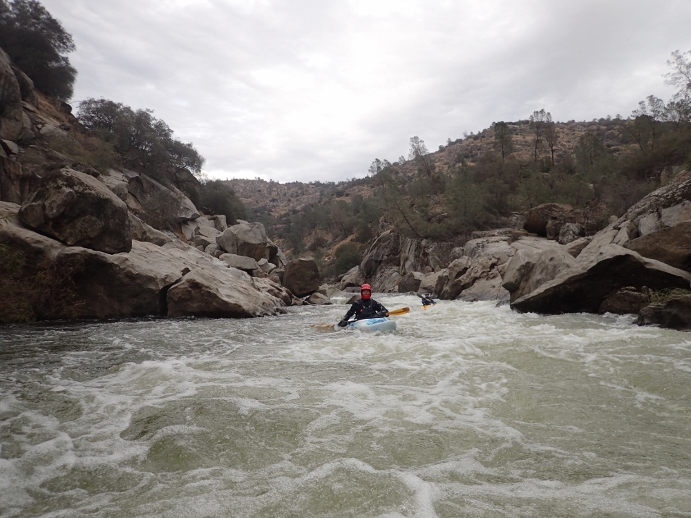 We opt to take a quick lunch break as it was now almost 2 o'clock and haven't eaten yet. There was some discussion that the one or two rapids we ran were beefier than the prior day and that water must have risen. I honestly wasn't certain... I thought maybe it was a little bit up but not a whole lot. While sliding back in his boat Darin states he thinks it has just come up a foot since we got out, I paid it no mind. Downstream we get to a rapid that was a boof with a ledge the prior day, today it was a ramp with a soft hole... no ledge. This opened my eyes but still, we didn't think it would change what was downstream much. So with that optimism in mind I paddled up to the lip and committed to San Joaquin Bluff #1 before seeing what the increased flow had done. As I do, dread settles in, I yell over my shoulder to them to scout... they all wear ear plugs and none of them heard me... so they didn't know what was a shallow slide into a relatively calm eddy was now a full water boof into a recirculating and depressed pocket. I manage to get a good boof but carry too much right momentum and end up in a hole exiting the pocket, flipped I roll up onto then get flipped face first into the right wall where I am not in a recessed pocket. The prior day I ran the line near there, so I pushed off the rock into the outflow that I hoped wouldn't get me stuck in the hole nearby. Luckily it worked and I rolled up in time to see Darin have a sweet line through the bottom. Then Haven came through with a nice line through the top only to get stuck in the bottom hole in the middle, she battled and somehow made it out still in her boat... I think I would have swum! Next Shannamar came through and didn't get a good enough boof through the top, landing in the pocket and getting firmly stuck. Quickly I saw some ends getting through and a battle ensuing. It is actually one of the more worrisome situations I have seen. I could tell it had potential to hold her, I quickly exit the river. I am on the wrong side of the river but I am hoping I can work up to parallel to it and hit the 70 foot throw. I knew that ferrying over to the other side may not work as it was a very hard ferry to make and that even once over there climbing up the house sized boulders would take at least 5 minutes, all of that would be too late so best bet was to work up the size I was on. Close to a minute later I saw her still recirculating, now out of her boat. I jump a few more rocks... then to my great relief I see her float out, exhausted but alright. Darin and Haven managed to get her boat and paddle to shore at the lip of #2. The boat was pushed out of the main current and it pinned itself in the small side channel. Easy to access we quickly pull it out. Everyone is shaken up and pretty much over it as now we realize the flow is so high. We portage the entry move of #2 and seal launch in backwards below to then immediately ferry across to the left channel for the exit which we are all relieved to see is washed out compared to the lower flow. Downstream we make quick progress to take-out where we are grateful that the mini-epic didn't go any worse. We hike out to find Jeff sitting in a chair drinking a beer, having beaten us by a good bit. We share the news with him that the water rose and that almost certainly that is why his boat floated away.