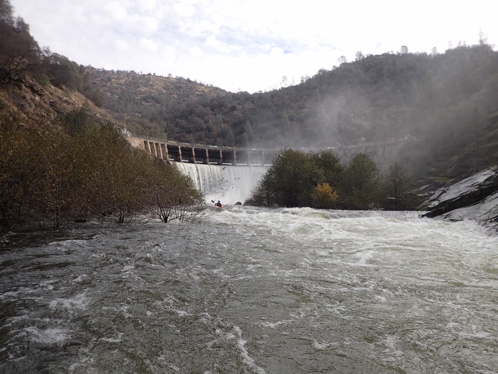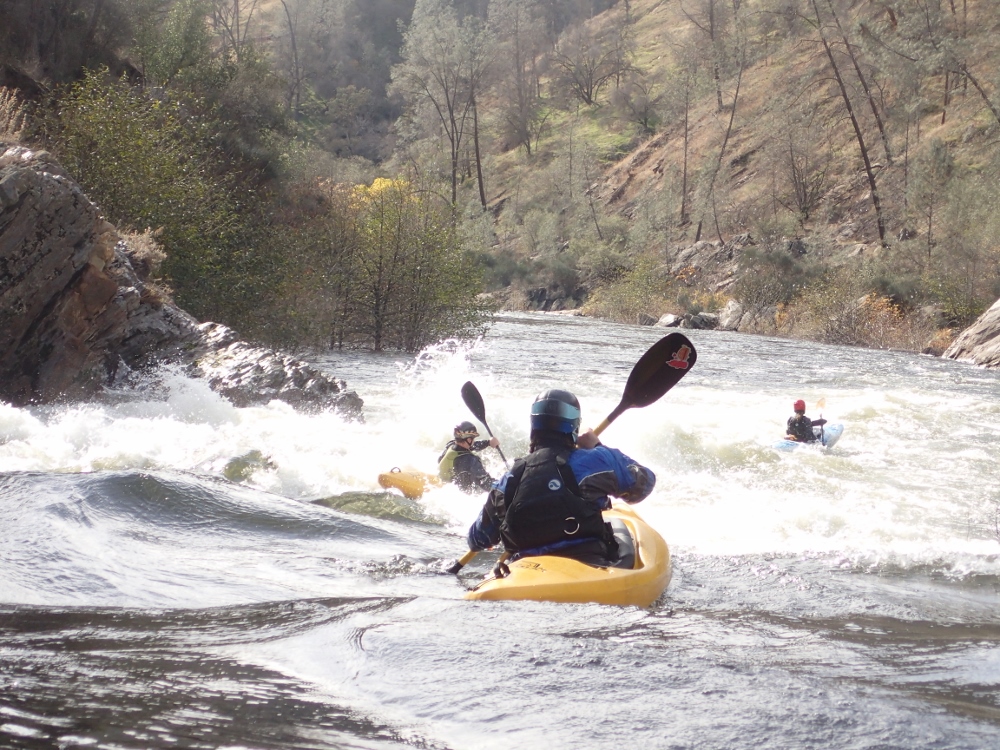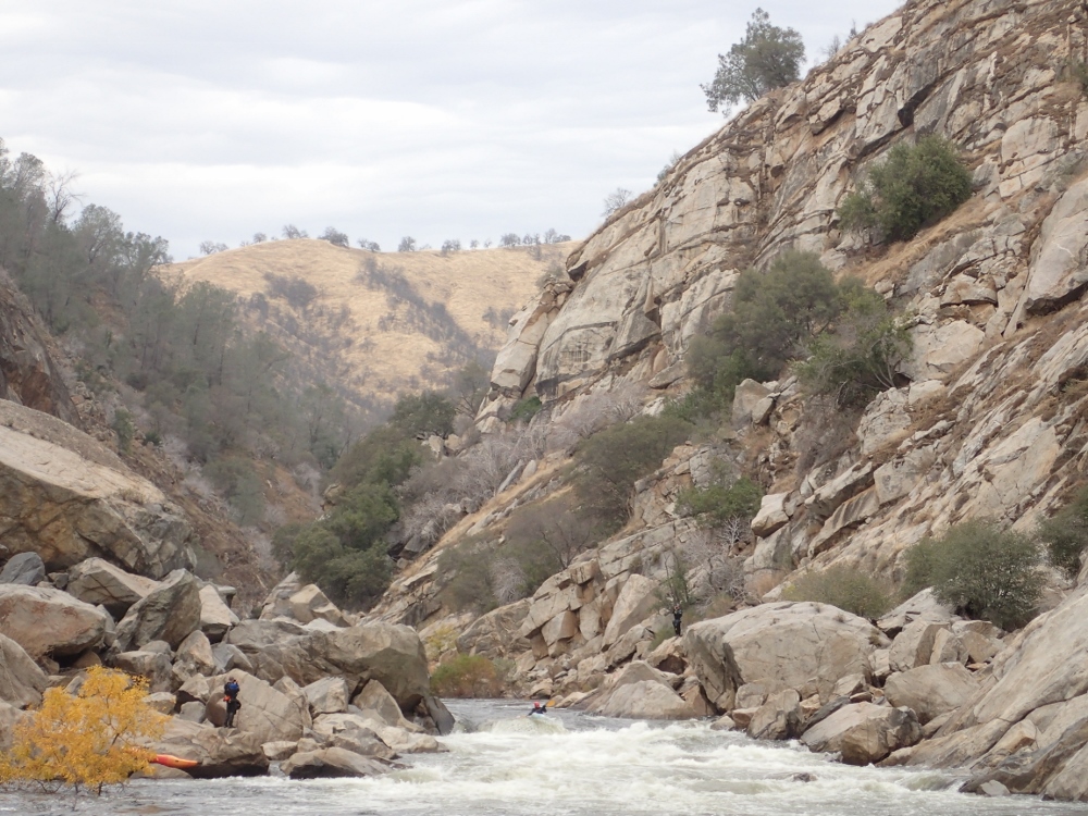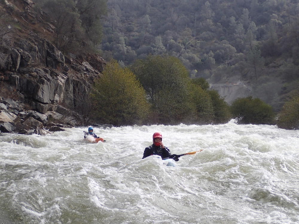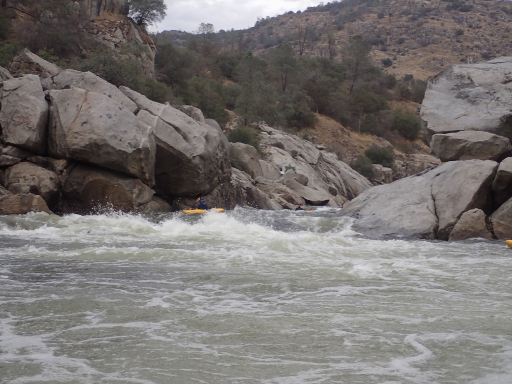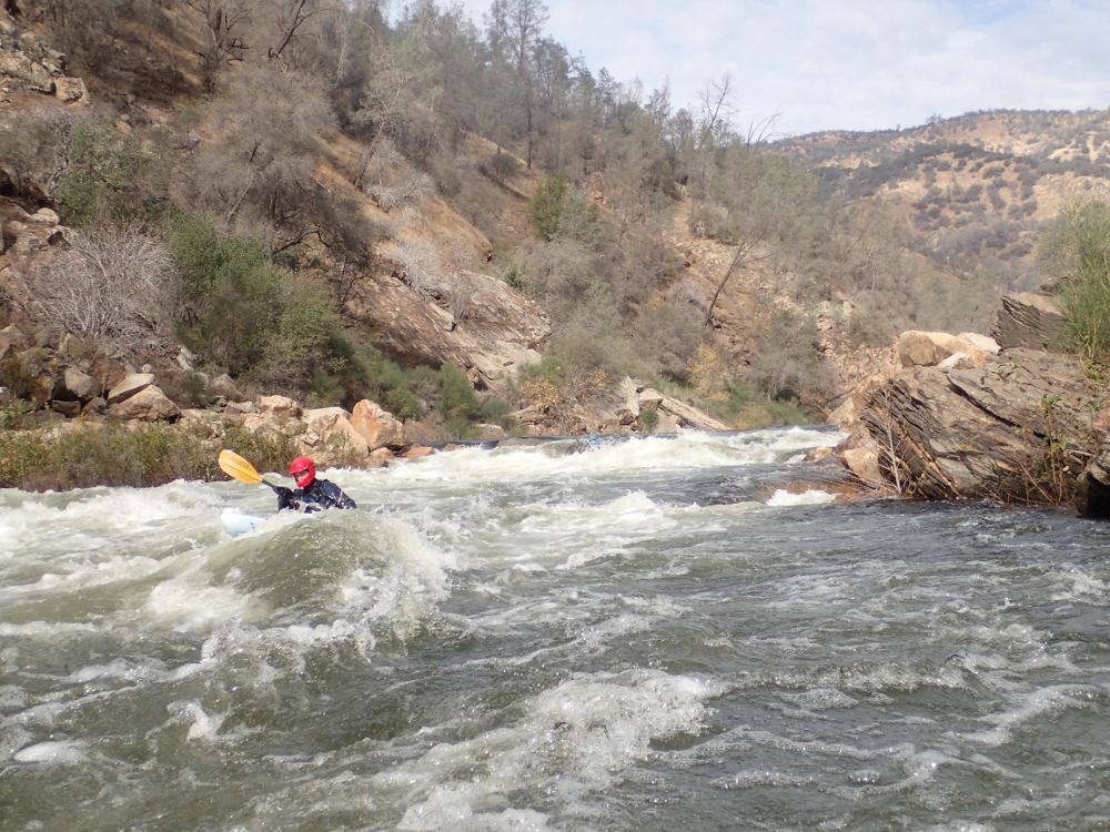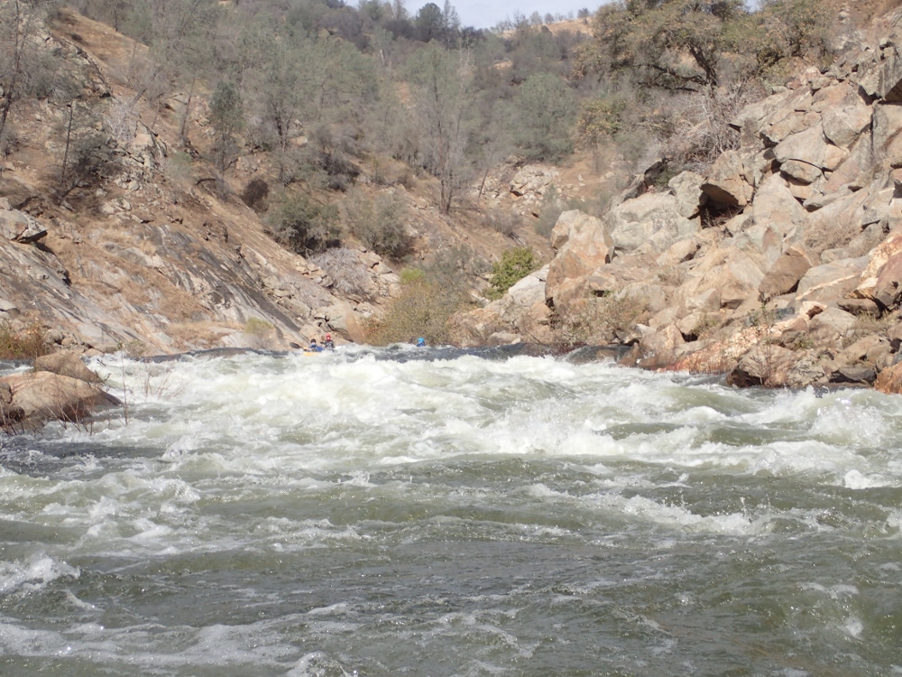 Putting on the river starts with some fun class III to III+ rapids. This then turns to long periods of flat water with an occasional rapid. I think at this point we were still on the 3,000 cfs rather than the 2,000 cfs that was just ahead of us. A few spicier rapids in the class III+ to IV range then opened up to mostly flat water with just an occasional rapid. Though those occasional rapids felt class IV due to the size of the hydraulics we were avoiding. All would have felt perfectly in place on the Lower Tuolumne. /the river makes a huge bend turning North West, South, then East... as it then bends back down to the South you finally reach the crux section. I hope you aren't tired from the flat water paddling as you will need your energy!