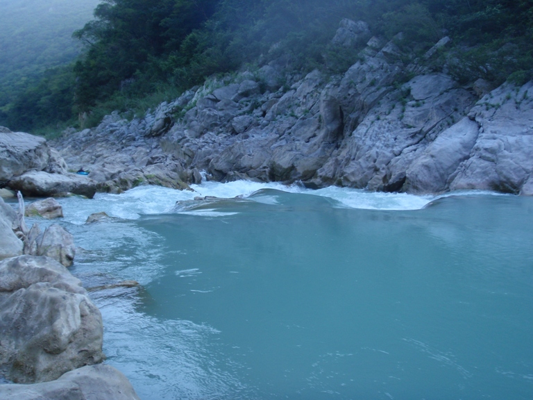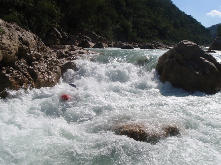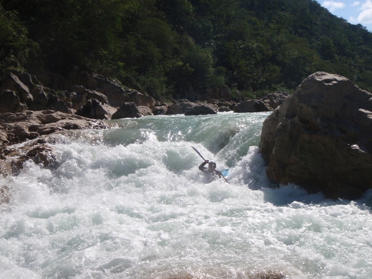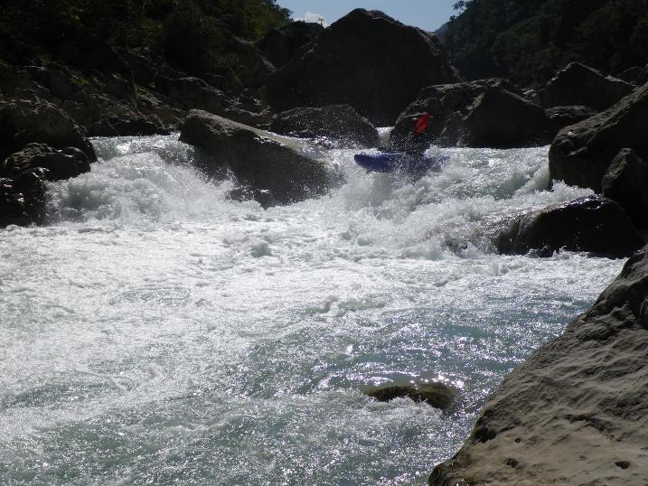 Gavilan (IV). A short S-turn that was blind until you entered. You want to end up right. there is a pocket eddy eating everything that enters to far right. Backed up by a rock creating a large cushion in the middle. Ride the cushion up and around the eddy. One in our group went left and it looked ok, but I am sure there was a reason why the beta said to avoid that side.