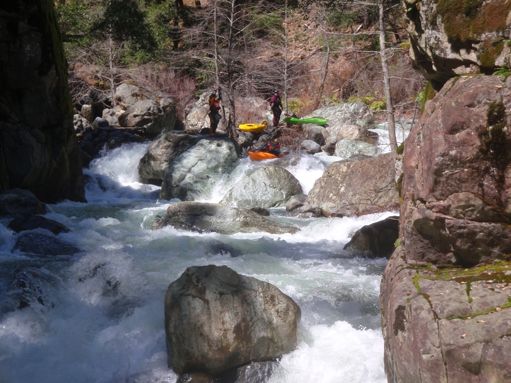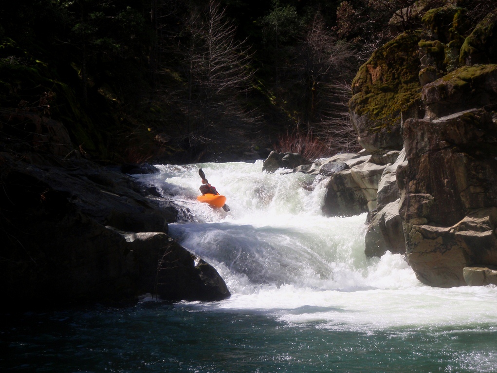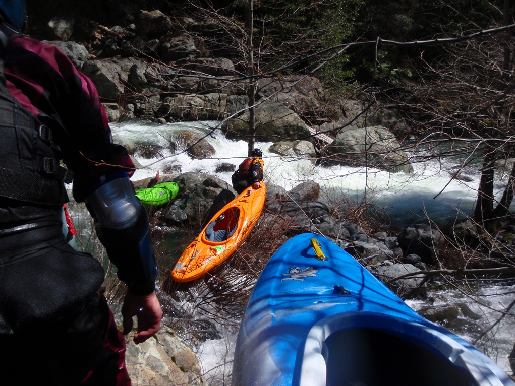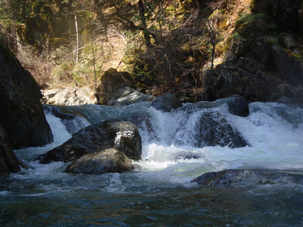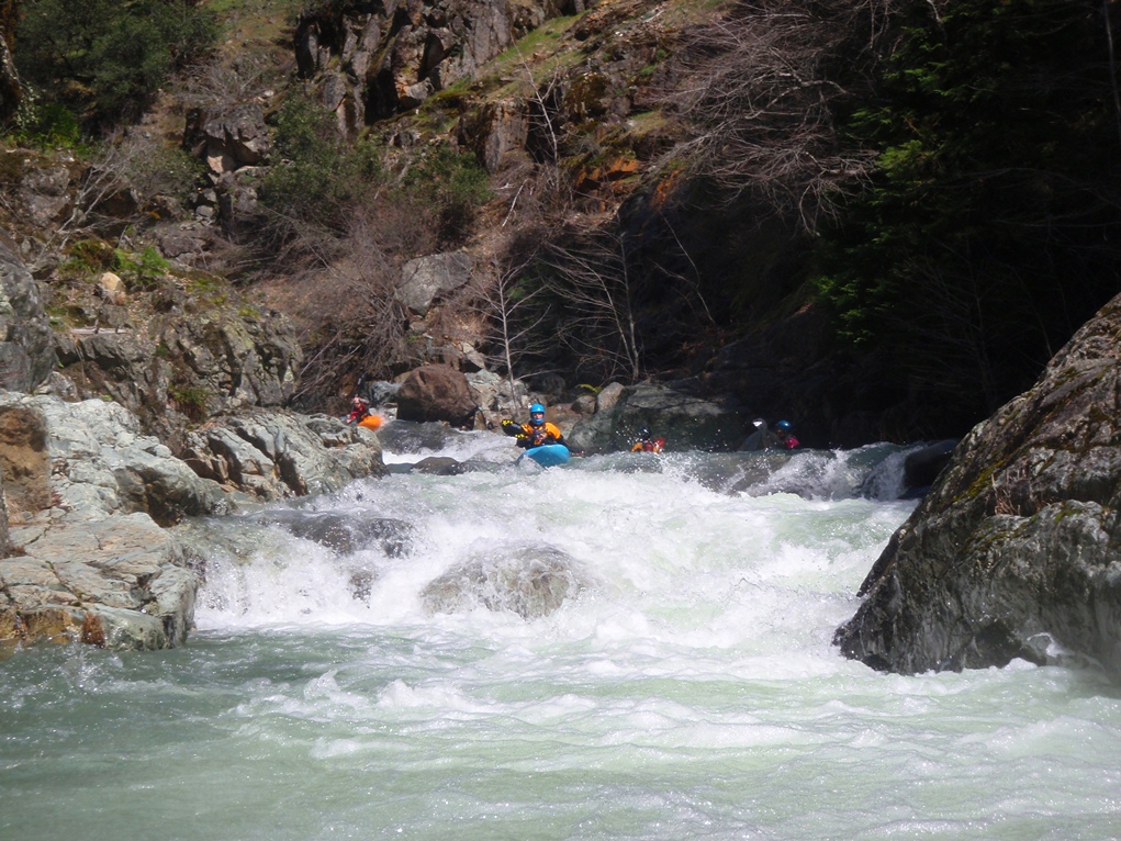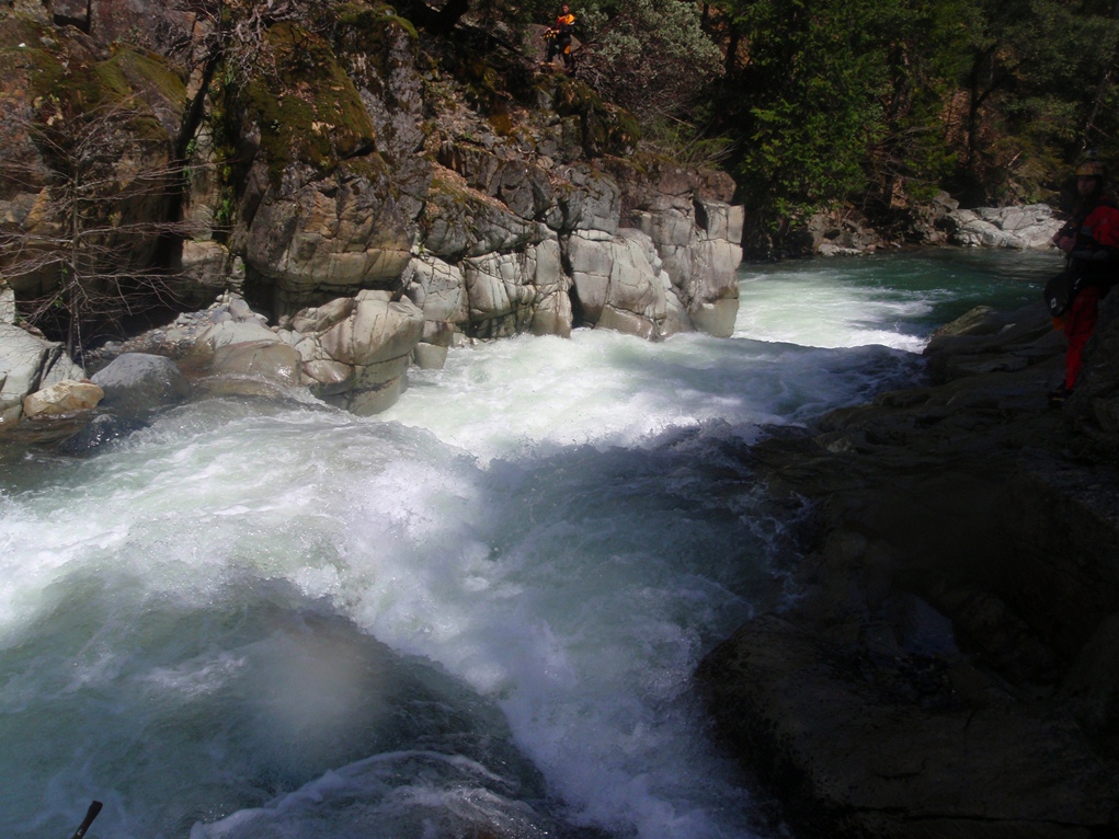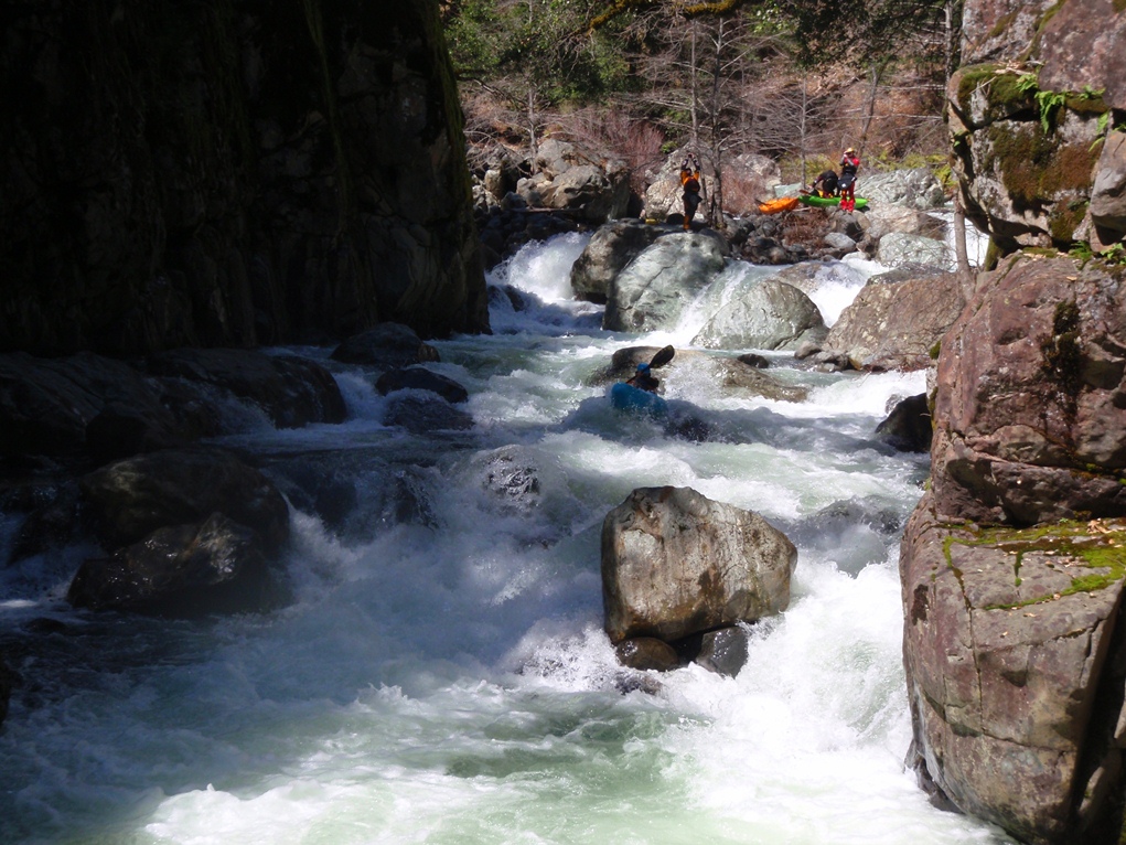Slate Creek is a little tributary to the Sacramento River just above the inundation that is Lake Shasta. The creek tends to only get run after a recent rain when the Sacramento River is reading over 3,000 cfs at the Delta. However, we got a little luck and got a early warm spell with 170% after snow pack which brought the Sacramento up to 5,500 cfs and Slate Creek up to the runnable level. However, just because the Sacramento is at these levels certainly does not mean the creek will be runnable, the only way to know for sure is to go to take-out and peak at the painted gauge. Now here too lies a difficulty. We had ~9" on our first lap and 11" on our second. Both good medium to low flows. However, approximately one third of the river is diverted just above put-in and is returned just before take-out, thus the gauge represents more water than the good section of rapids will actually have. Why do I mention this to you? Because the diversion is not always on, thus 11" on the gauge can also be a juicy (aka healthy, aka very splashy) flow. If the rapids at put-in look a little low, manky, but doable, than it is probably a good flow for your first time down. Even at lower flows, the rapids are very continuous and eddies small. At high flows I have heard you just hang on for the ride and don't stop until you are below Black Jack Falls. So buyer beware. Apparently people usually draw the low water cut off at 6" on the gauge but I have also heard of really low water runs down to 3"... though I cannot imagine how much their boat disliked them at the end of that day...