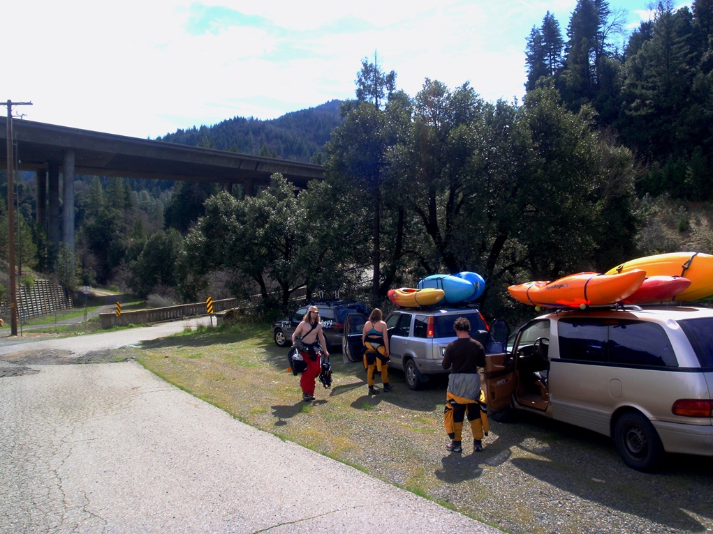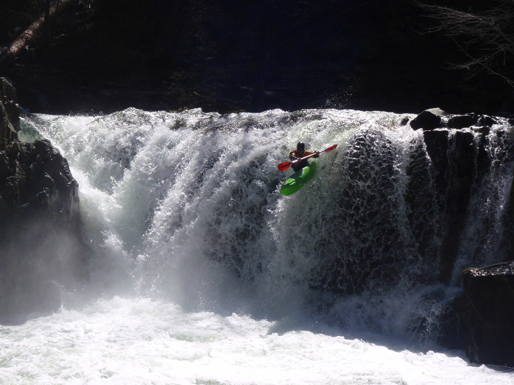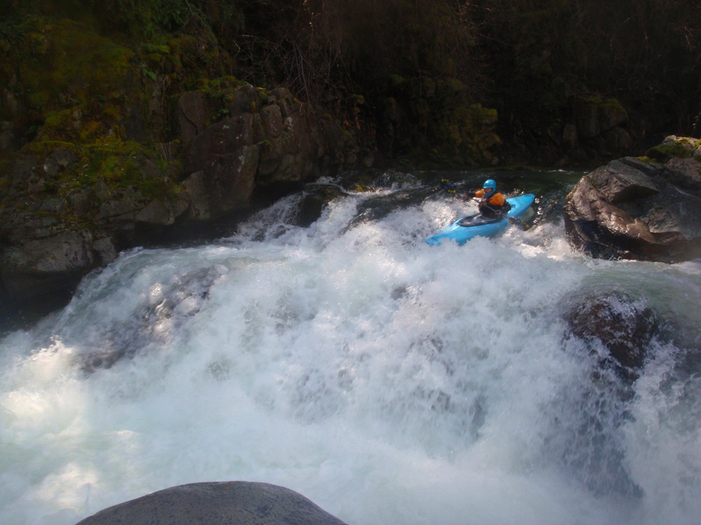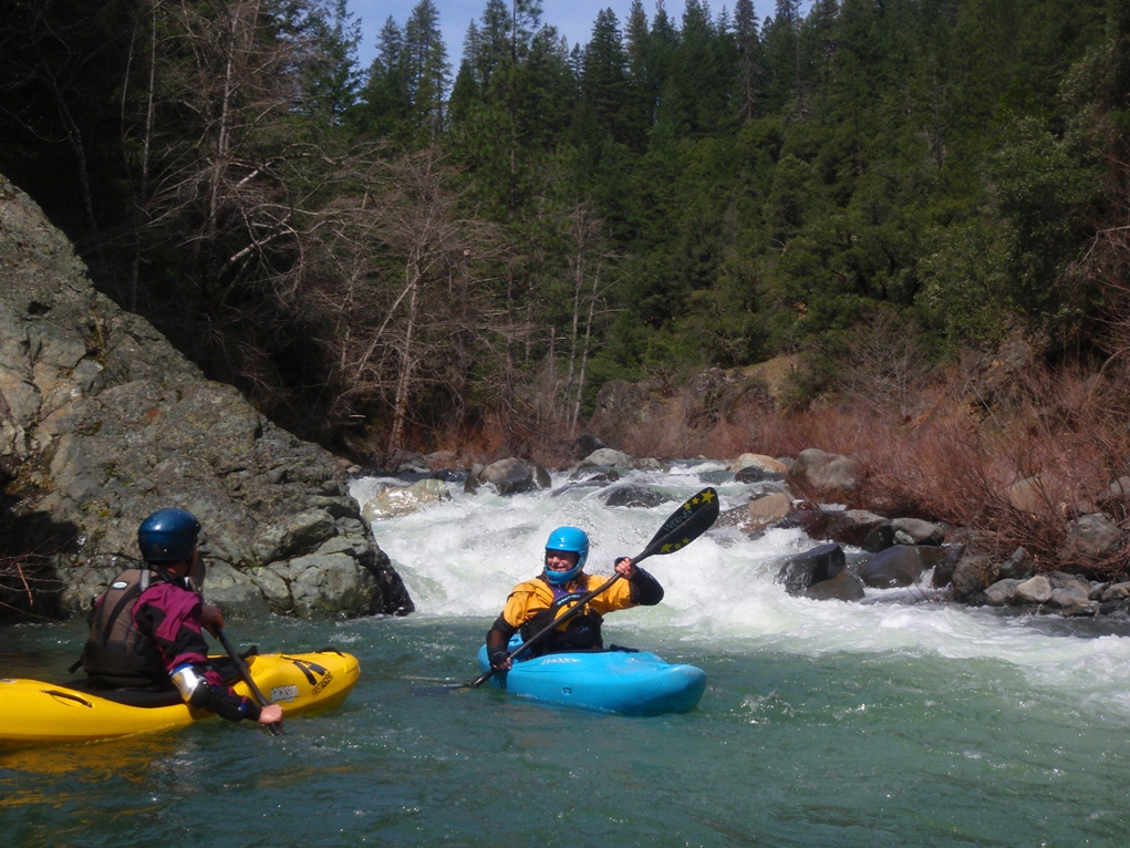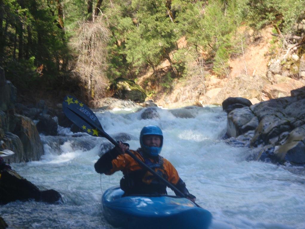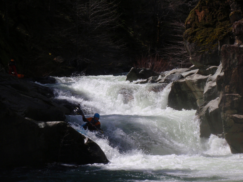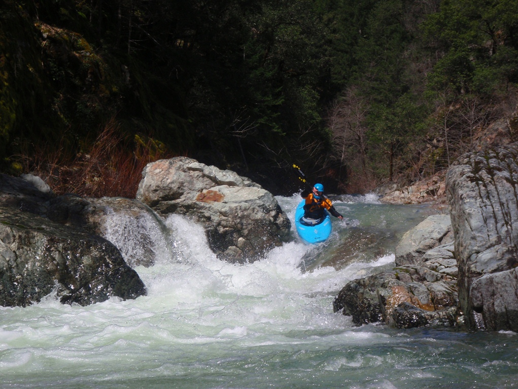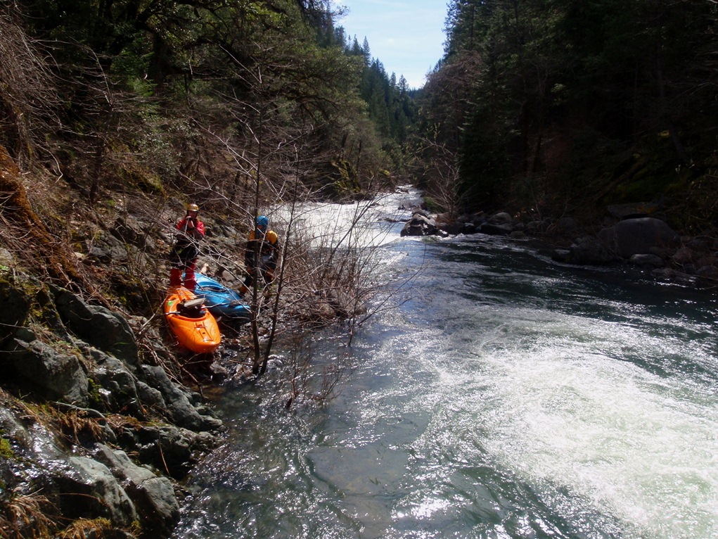 Slate Creek is a little tributary to the Sacramento River just above the inundation that is Lake Shasta. The creek tends to only get run after a recent rain when the Sacramento River is reading over 3,000 cfs at the Delta. However, we got a little luck and got a early warm spell with 170% after snow pack which brought the Sacramento up to 5,500 cfs and Slate Creek up to the runnable level. However, just because the Sacramento is at these levels certainly does not mean the creek will be runnable, the only way to know for sure is to go to take-out and peak at the painted gauge. Now here too lies a difficulty. We had ~9" on our first lap and 11" on our second. Both good medium to low flows. However, approximately one third of the river is diverted just above put-in and is returned just before take-out, thus the gauge represents more water than the good section of rapids will actually have. Why do I mention this to you? Because the diversion is not always on, thus 11" on the gauge can also be a juicy (aka healthy, aka very splashy) flow. If the rapids at put-in look a little low, manky, but doable, than it is probably a good flow for your first time down. Even at lower flows, the rapids are very continuous and eddies small. At high flows I have heard you just hang on for the ride and don't stop until you are below Black Jack Falls. So buyer beware. Apparently people usually draw the low water cut off at 6" on the gauge but I have also heard of really low water runs down to 3"... though I cannot imagine how much their boat disliked them at the end of that day...