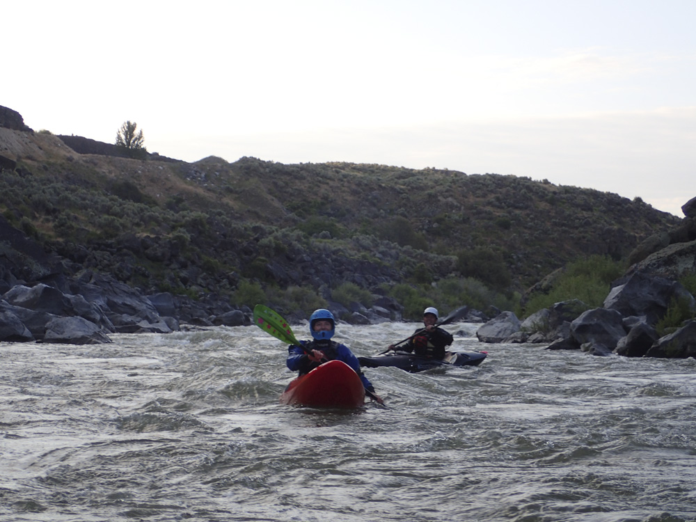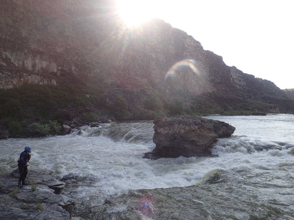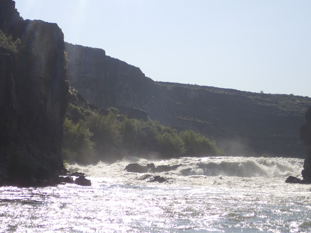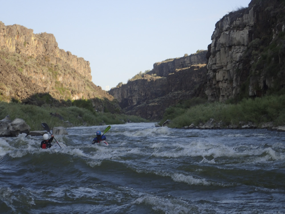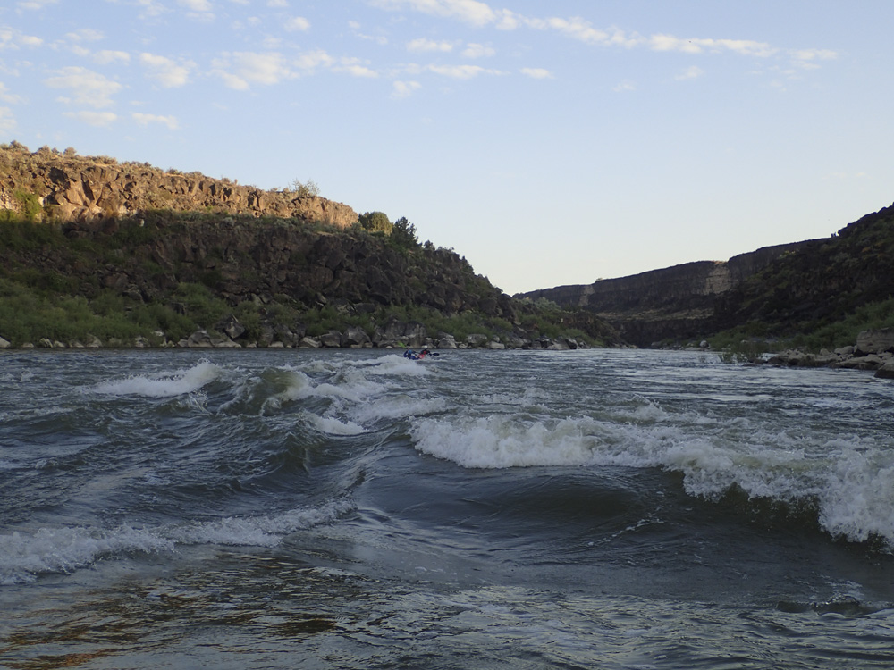The plan was originally to bike the shuttle, freeing Amanda to hang out with Penelope at camp or wherever. But after driving to Shoshone Falls the night before, we realized that the bike was going to be very long, and a hitch not likely as it was on small, gridded, farm roads. So, with her normal helpful demeanor, Amanda said that she could pick us up at the bottom. The other part of "the plan" was to get an early start. After the run, Diane and I intended to drive 9 hours to Portland where my family was all gathering for a wedding of a cousin the following day. So, the earlier start on the drive the better as it would allow me to actually socialize that evening with the aunts/uncles/cousins/siblings/nieces etc. So, with an alarm at 5 am, we were leaving camp by 5:30 and putting on by 6:15 am. We anticipated the rather long run taking us at least 3 hours, if not 4. We also weren't sure what the flow was going to be, the gauge had been crapping out, and we thought we would have somewhere in the 1-2000 range, which is not really a full flow for the river. Upon putting on, we found that we had 4,000 cfs which is a nice flow for the river for sure, and also made for much faster time down the run. We realized that we would make faster time as we pealed out and ran the first rapid or two, both of which were fluffy, fast, and surprisingly powerful. Thankfully the water was warm as the morning was still early and the sun far from cresting over the canyon walls.