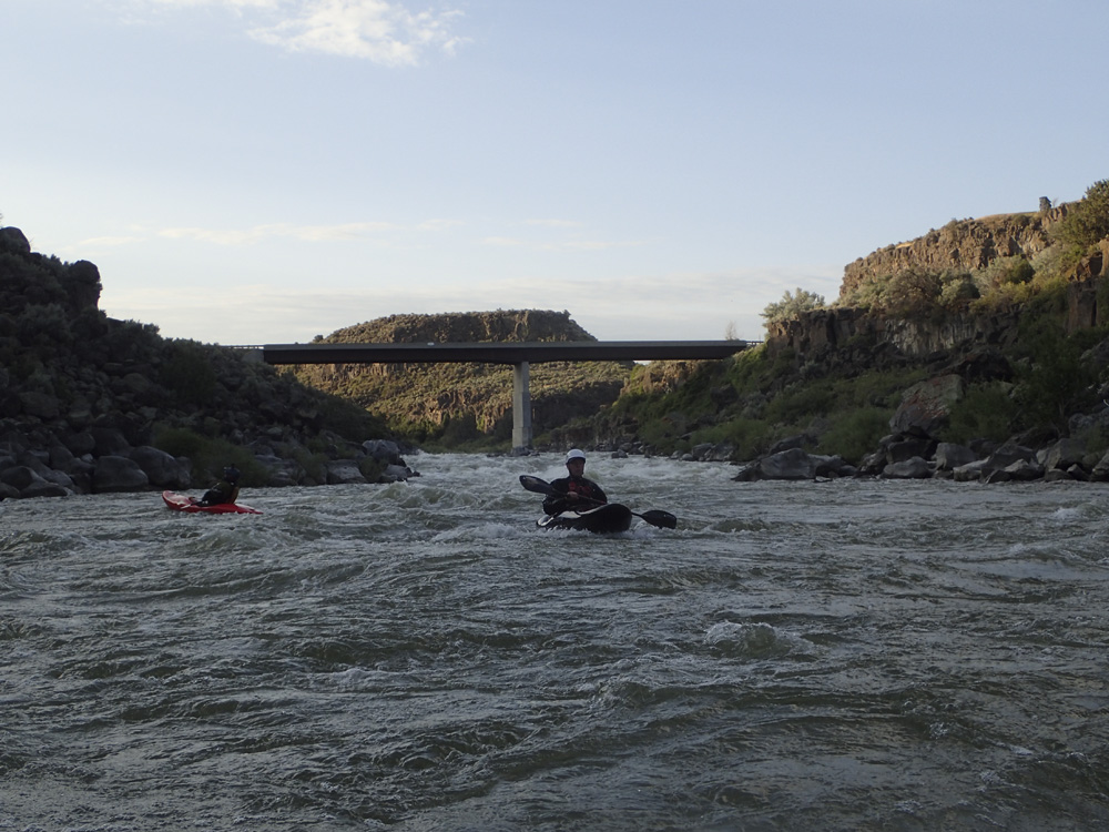 - Pair of Dice (IV to IV+). The biggest rapid on the run, we scouted it from the left. At 4,000 there was an eddy at the lip. At higher flows you might have to get out earlier as the channel had flow through it that we hoped out onto the big island to scout from. There were a few lines. The river left channel makes a 90 degree turn with some water dropping over a ledge into the turn. We ferried out below that drop and went straight down the far right side of the turned water. The left side was a junky pour over at this flow. The river right channel is a huge pour over so don't venture into that unless you know what you are doing. Apparently at really high flows, you have to run the right side ledge hole (called Paradise)