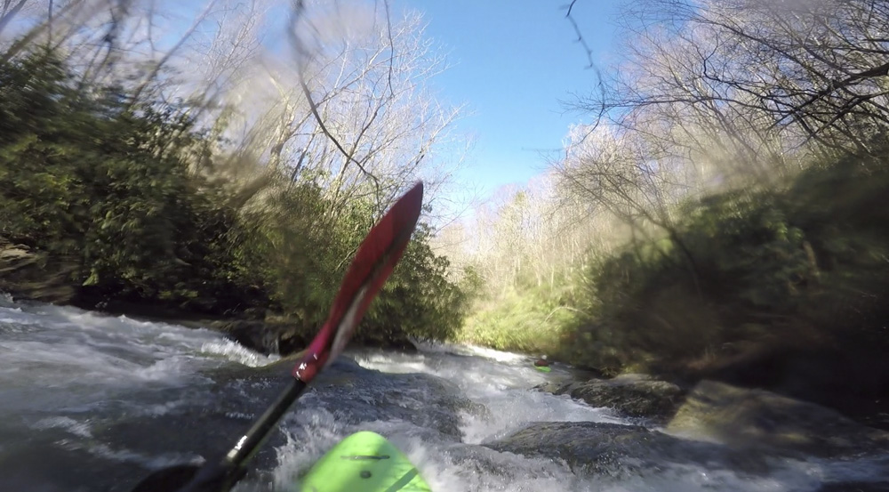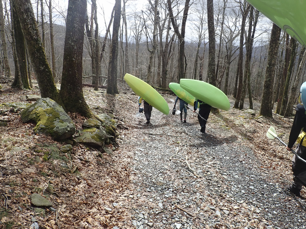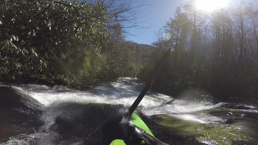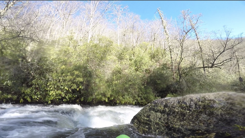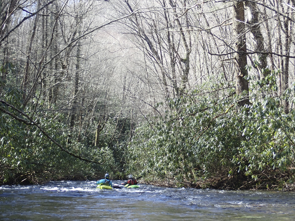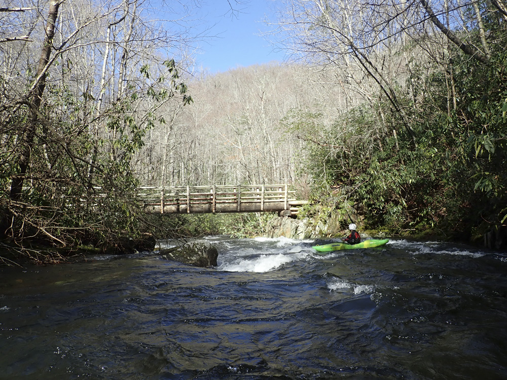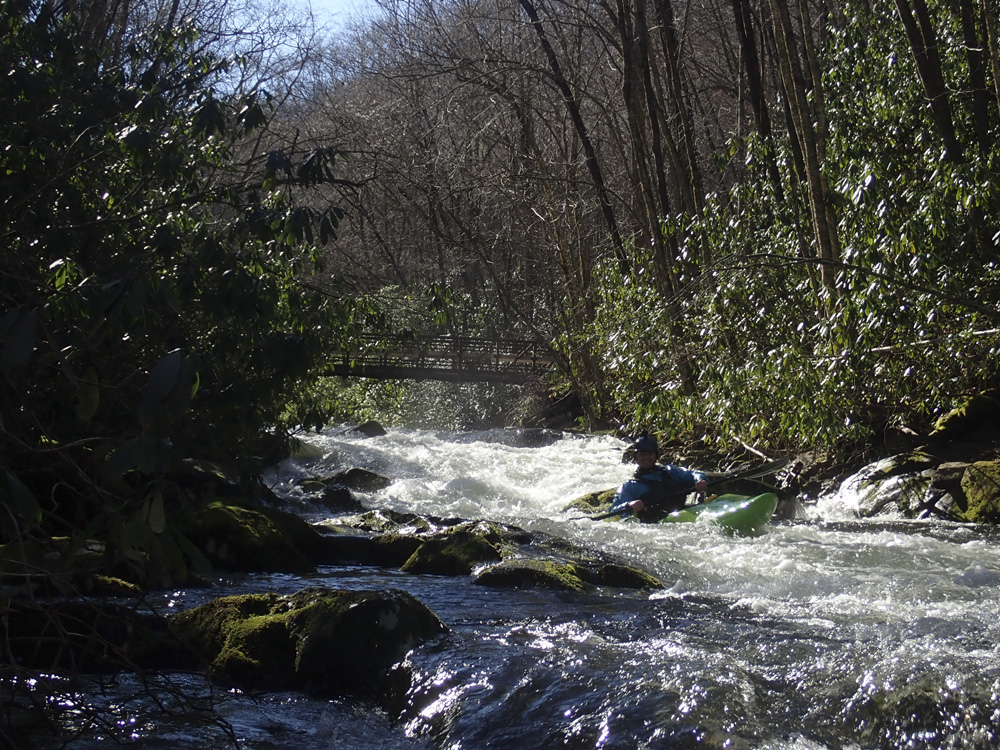 Once at the river, we found flow low, but floatable so we put on before Bearpen Branch and manked our way down to where enough water had collected to begin to feel like boating. Quickly, you get to the first big rapid, a straight forward slide. It is worth having one look at it on the right to ensure it is clear of wood. Below, things continue in the sorta manky manner down to the Middle Falls, which is probably the most time consuming place. For starters, it sneaks up on you, and it has a lead in. So scout early on the left. The lead in goes to a shallow lip of a 20 foot falls that you want to hit in the right spot. Use the trail and spurs to scout it on the left. Below, things get a little better, but are mostly class III. Things change however when you cross under the trail bridge. This is the sign that you are getting to the last two big rapids. The first one reminded me of Staircase Falls on the Horsepasture River, though easier and less tall in each step. The second one is the most complicated rapid on the run, and requires a boof to the left of an island for a tricky ramp down around a large pocket hole at the base of the cascade. Drive left! Below this, the boogie ramps up. Now it is non-stop class IV, which with the wood threat, feels like class IV+ at times. The miles do go fast though, assuming the wood is avoidable and you are able to stay in your boat. And before you know it, you are done.