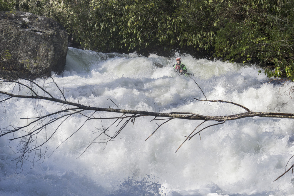 - Upper Falls (IV to IV+). You come around a bend, the river widens, the bed turns to bed rock, trees clear and the sun hits you. You are above this falls. Have one person look from the last minute eddy on the right to check for wood. Everyone, just route down the middle for this long and super fun slide.
