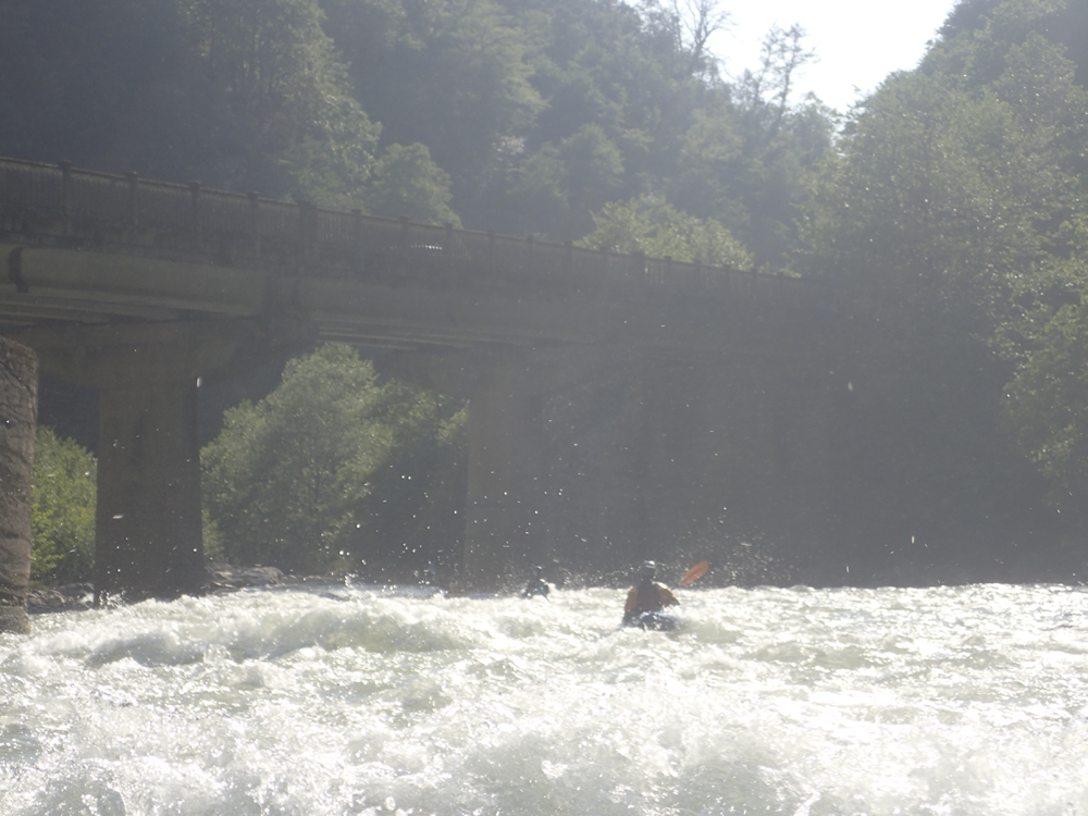 Post-Bridge (IV). Immediately downstream, the river entered a congested rapid that changes regularly. We entered center and drove hard right through the middle to exit middle. It was junky and full of rocks.