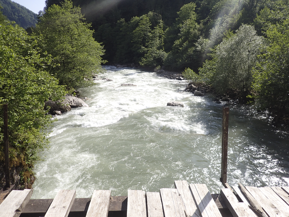 - Bridge / Start of Gorge (III to IV). You pass under the bridge and enter the final gorge. The first few rapids are straight forward enough, be aware that the rock has changed to a sedimentary thing that has some ugly looking spots. Stay away from the biggest boulders.