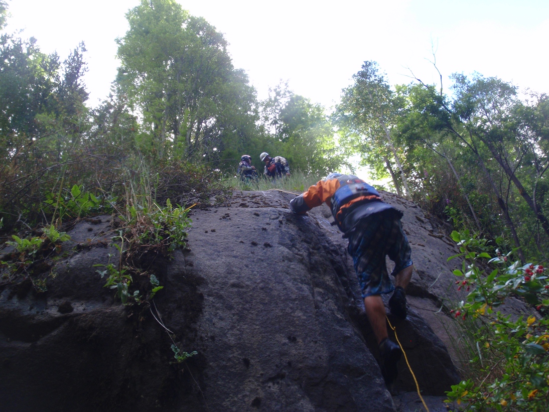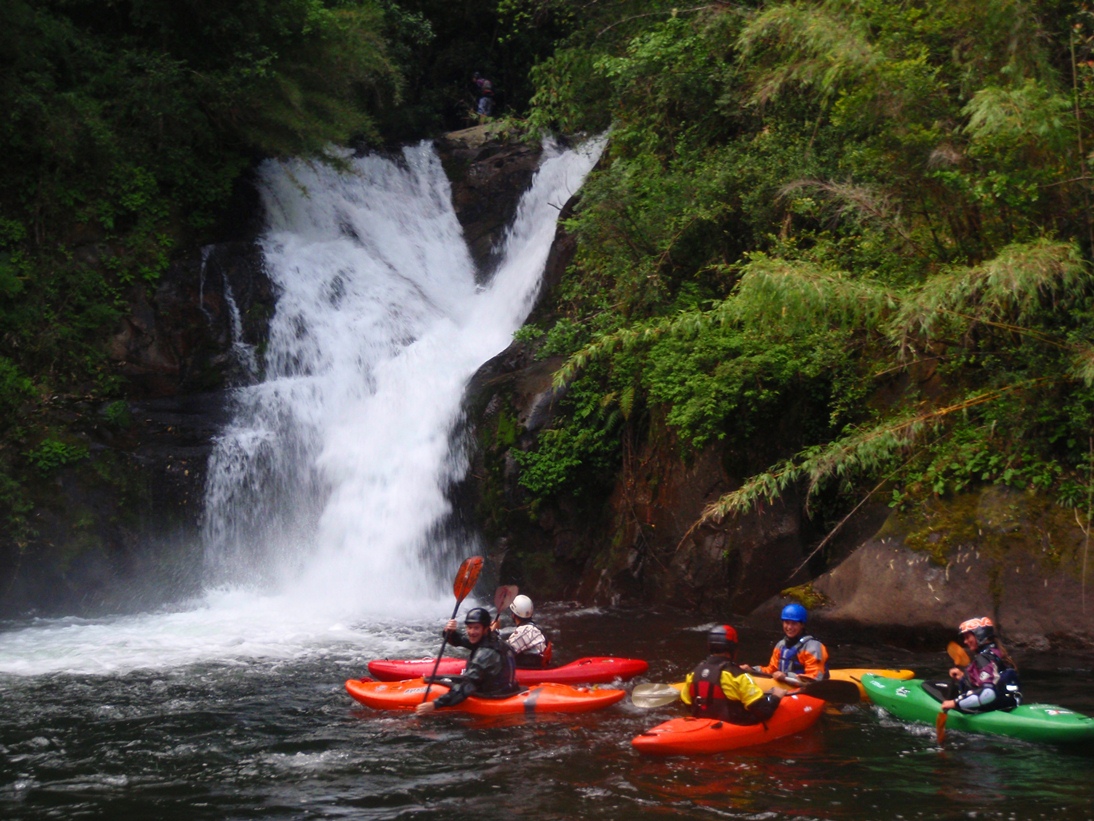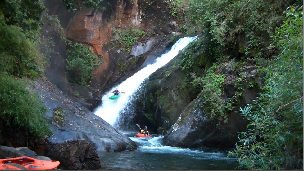 Put-in: Go up the trail. Once at the top of the Third Falls, set a rope to climb out. You can also scout it and the landing of the falls above. Then continue up the trail to the top of the zip-line. Cross through the barbwire fence. On the other side, keep going upriver and you will quickly see a trail leading down to the water again.