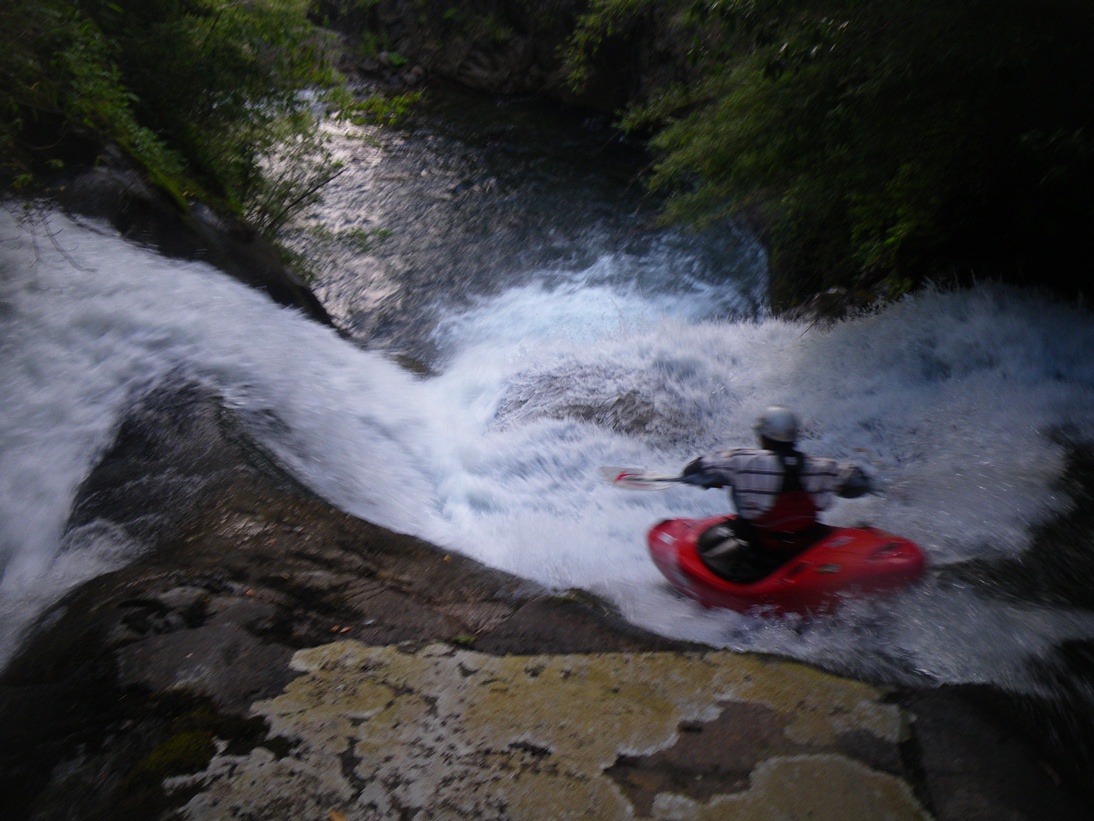First Falls (U). An unrunnable 25 foot falls lands in about a foot of water. We walked on the right in the wooded area. We used ropes to lower our boats. We then slowly slid our way down to the water with 50% of our group eating it on the slab below that was like butter. Alex was reasonably comical as he slide all the way down into the eddy before the lead in to the runnable section.