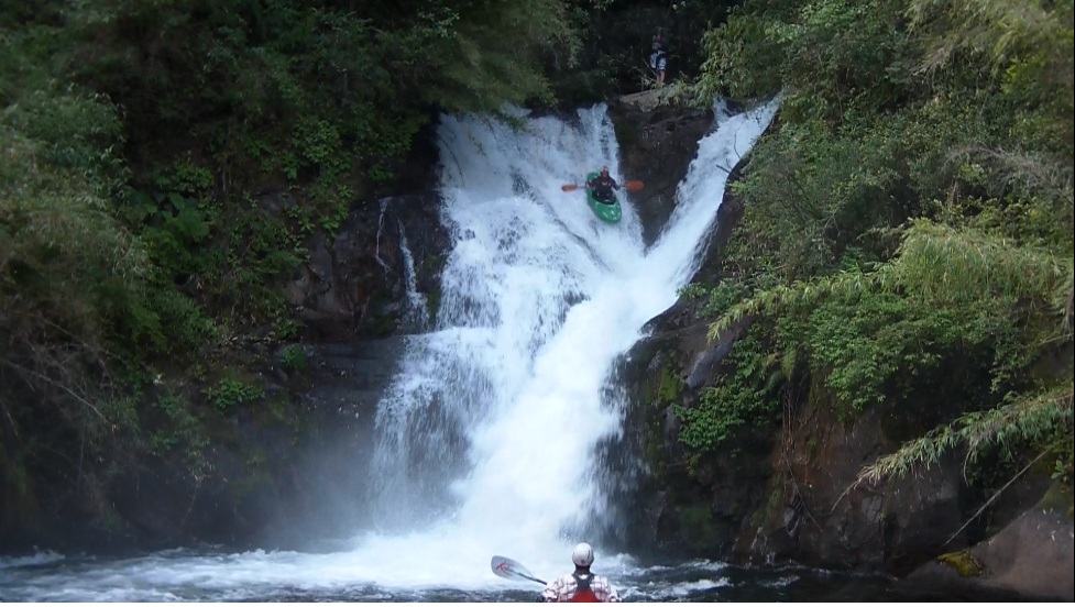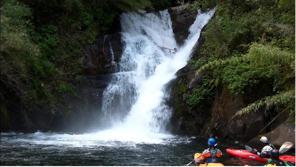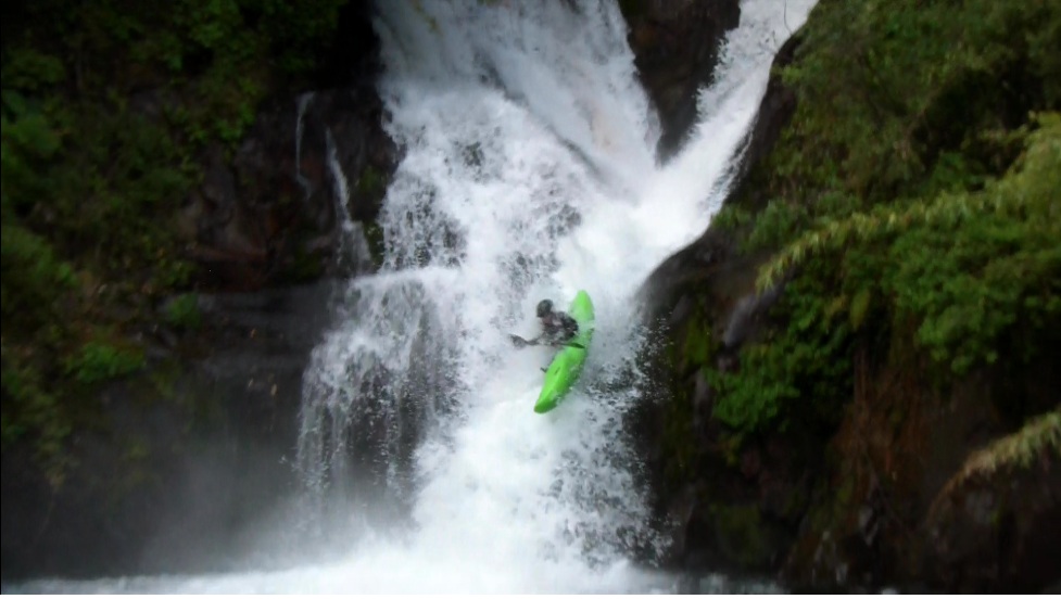 Second Falls (V- to V). Such a sweet drop, unlike some of the waterfalls in Pucon that start in pools and end in pools, this one makes you work for it. First, very in front of the wall, careful to not slip into the hole just off your bow. Then drive right to boof the first 4-5 footer. Then line up the final falls. The first 15 feet are a steep slide followed by 10-15 feet of vertical falls. Land with a little left angle and beware that it wants to boof you out a bit. All but Diane had sore backs the following day thanks to this drop.