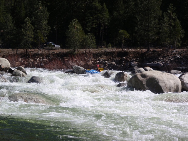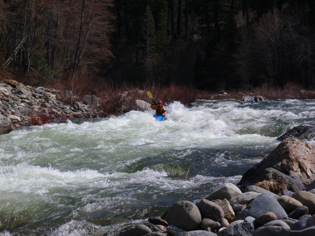 - Right Turn (II+). Just down stream of a bridge the river makes a strong right turn. There is a log blocking the left ¾ of the river. It is not hard to get right. At high flows though I was told the river swings out harder and takes you too the rocks that become large holes. Now with the tree there this could be a danger at flows over 1,500 cfs so be aware.