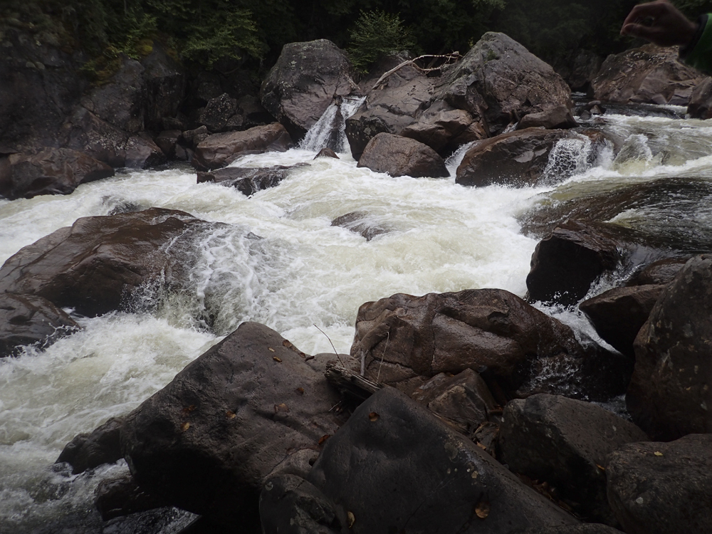 - Portage (V+). Not far below those rapids, at the end of a brief section of flat water you will notice the river tightening back up. You will also notice a metal structure on the left. Get out here. There is a trail up and around a triple drop of falls. Stay on the main trail, don't get tricked into following tagging. If you do it will be bushwacking. If you miss the portage location. Falls 0 is runnable and is a slide that you want to be far left on if you bumble into it. You want to be left as there is an eddy at the lip of the first falls on the left. Get out and bushwack your portage on the left. The first falls looks ok but goes directly into the second falls and then that into the third. The third has a huge reconnect near the bottom. In total they drop around 90 feet. Two descents that I know of have been made. The first ended in a concussion and the second moments later by his friend resulted in broken ribs. If you ask me... they got a little lucky! Put back in 200 yards downstream of the falls. Also, apparently some people take-out here to avoid the gorge downstream.