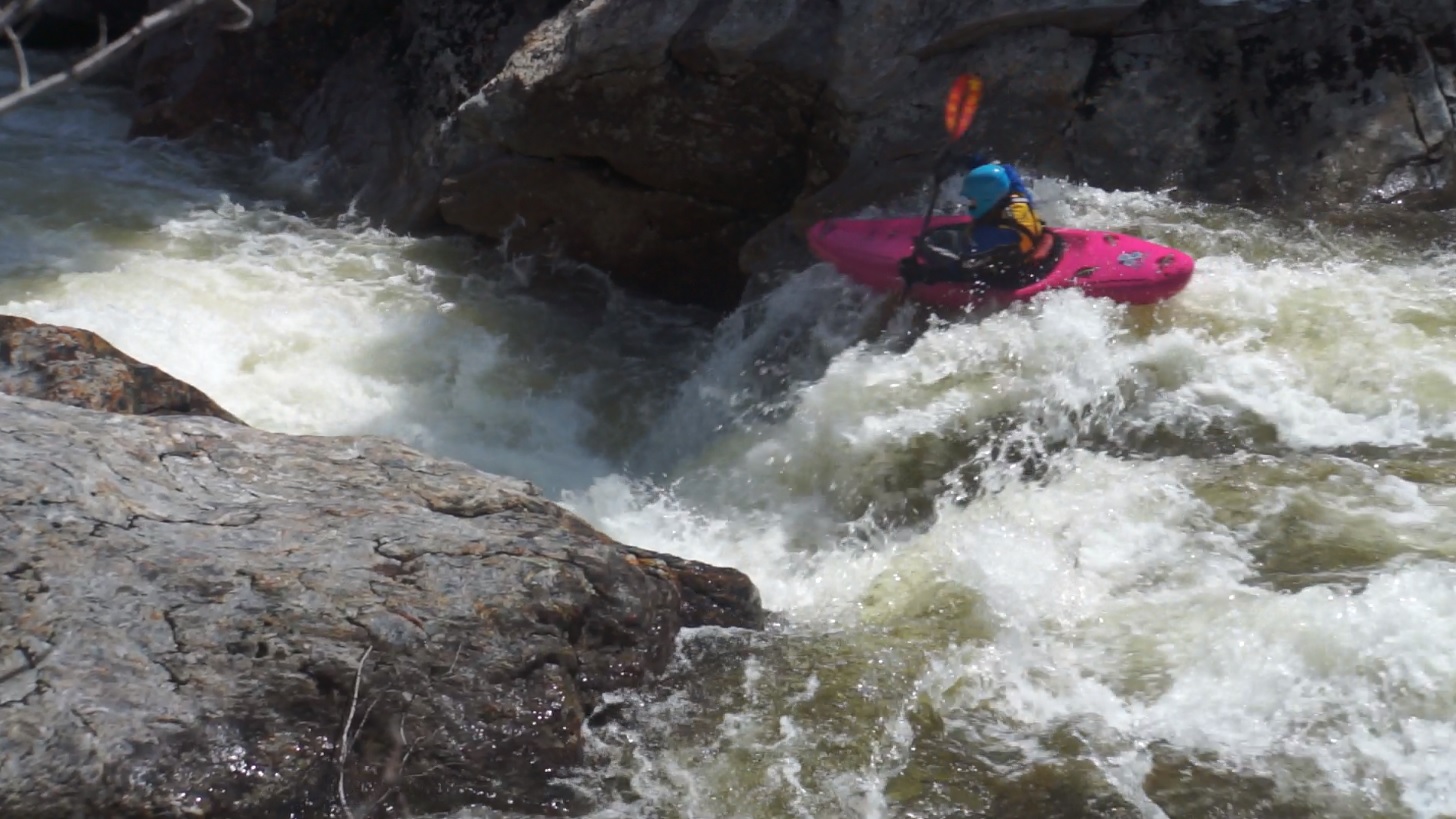 - High Chair (IV to IV+). Once you pass the lumber yard, the river braids out. We went with the main flow down the middle moving left and punched left through a decent hole at the bottom. Diane flipped and ran the exit blind as I yelled the beta I could see from my eddy. Straight forward enough thankfully though, the river s-turns and pillows up on a large boulder on the left shore. Just ride the pillow.
