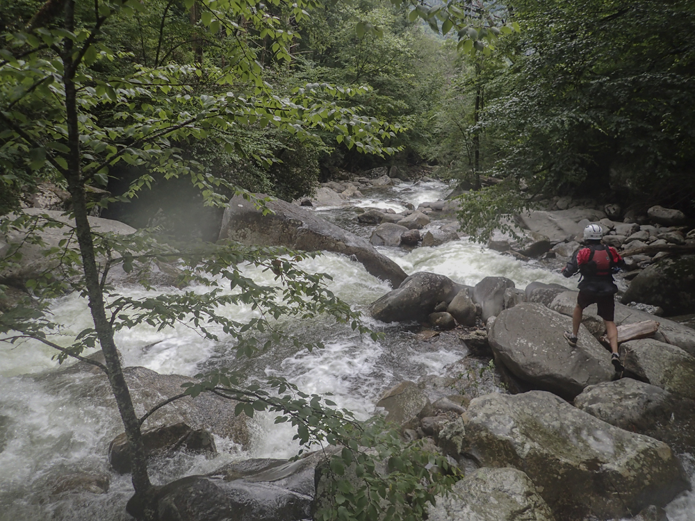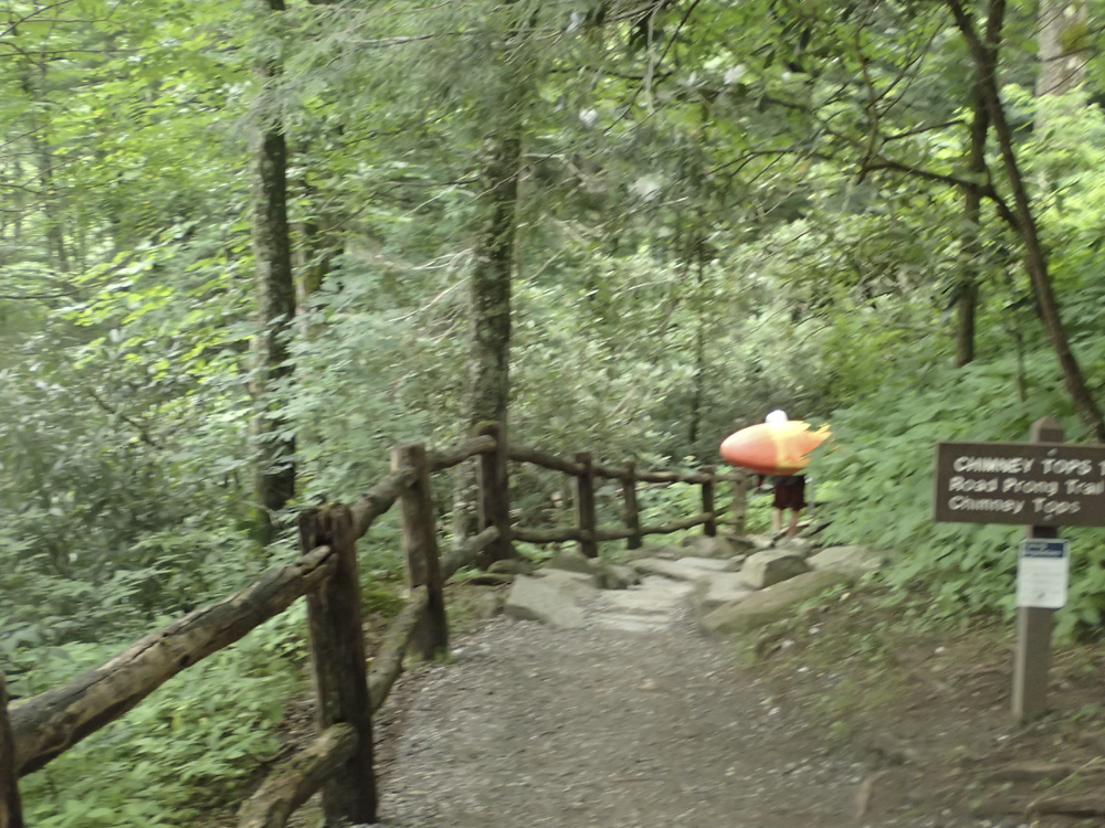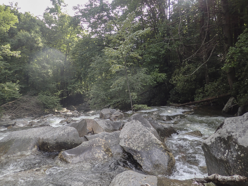 Put-in: Continue for 2.4 miles to the Chimney Tops Trail Trailhead. Parking is on the right in the cemented lot. It can be crowded.