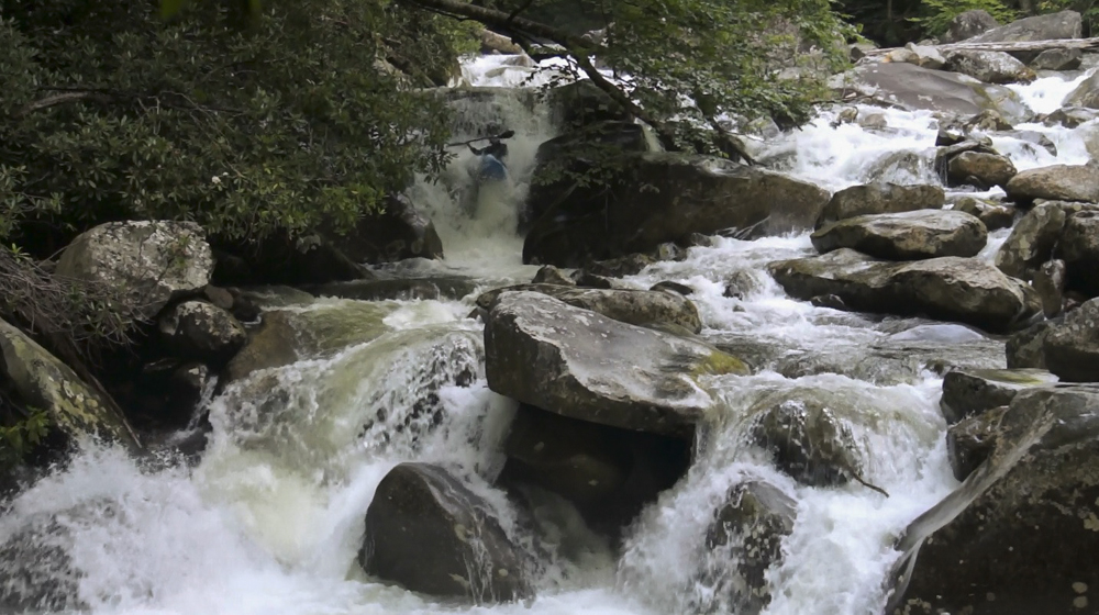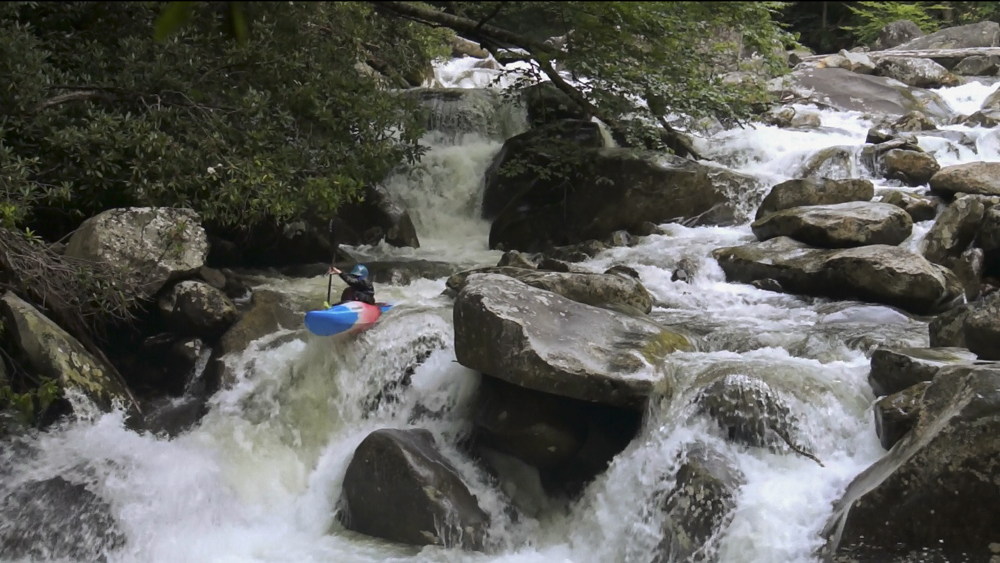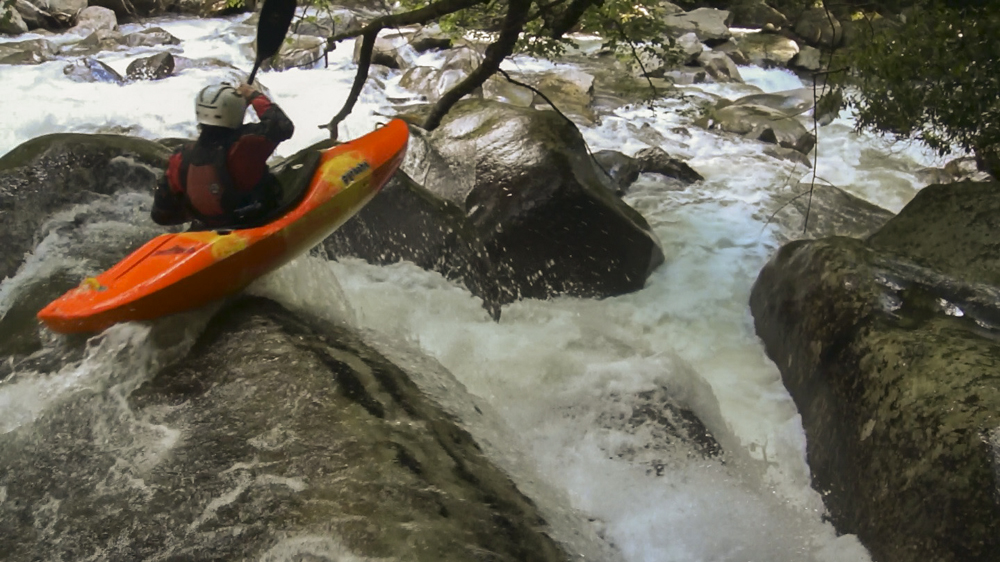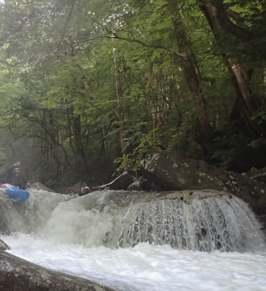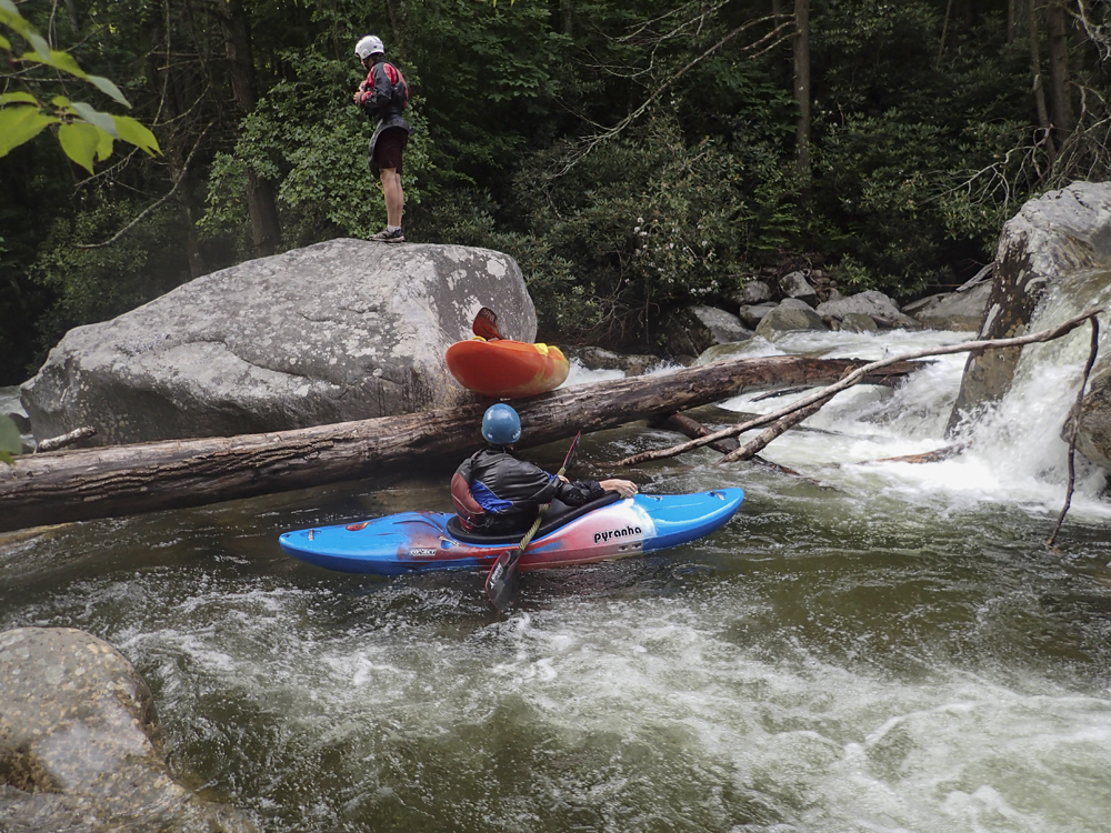 Boof (IV+). Just downstream is a tall boof that you want to hit far right, like a small micro channel far right. Check for wood. As soon as you land there is a sizable hole and the remnants of a tree that Jim Janney cut out that had caused some issues in the past. Another rapid is just below, we went far left, but I don't recall the specifics.
