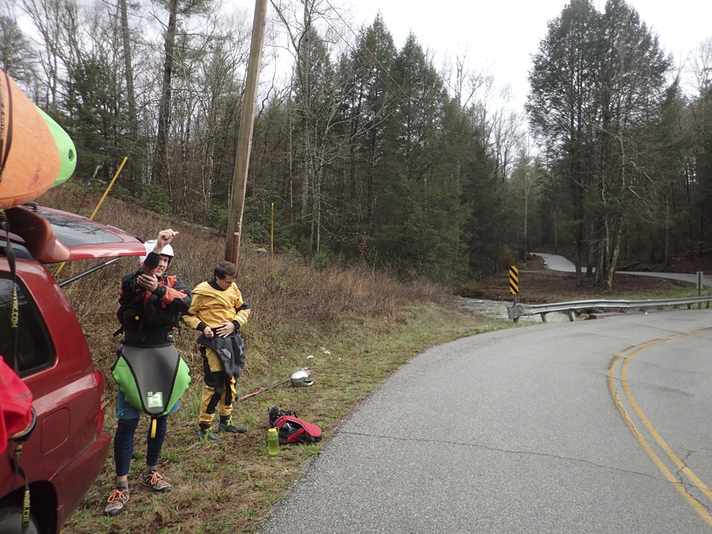 Arriving at the creek, I find Daniel Talley having just finished a lap. He reported it low. Too low for him to do another lap. Caleb Paquette shows up a short time latter and says it is low as well, and not worth it low as he has done it before at that flow. Next the eternal optimist, Jim Janney, shows up. He, like me, has not done it. We are motivated to give it a go if there is enough water to scrape down. Justin Cullars shows up and we drive to put in. There he too, says it is too low. But, Jim and I prevail and we put on and get Caleb and Justin to join as well!