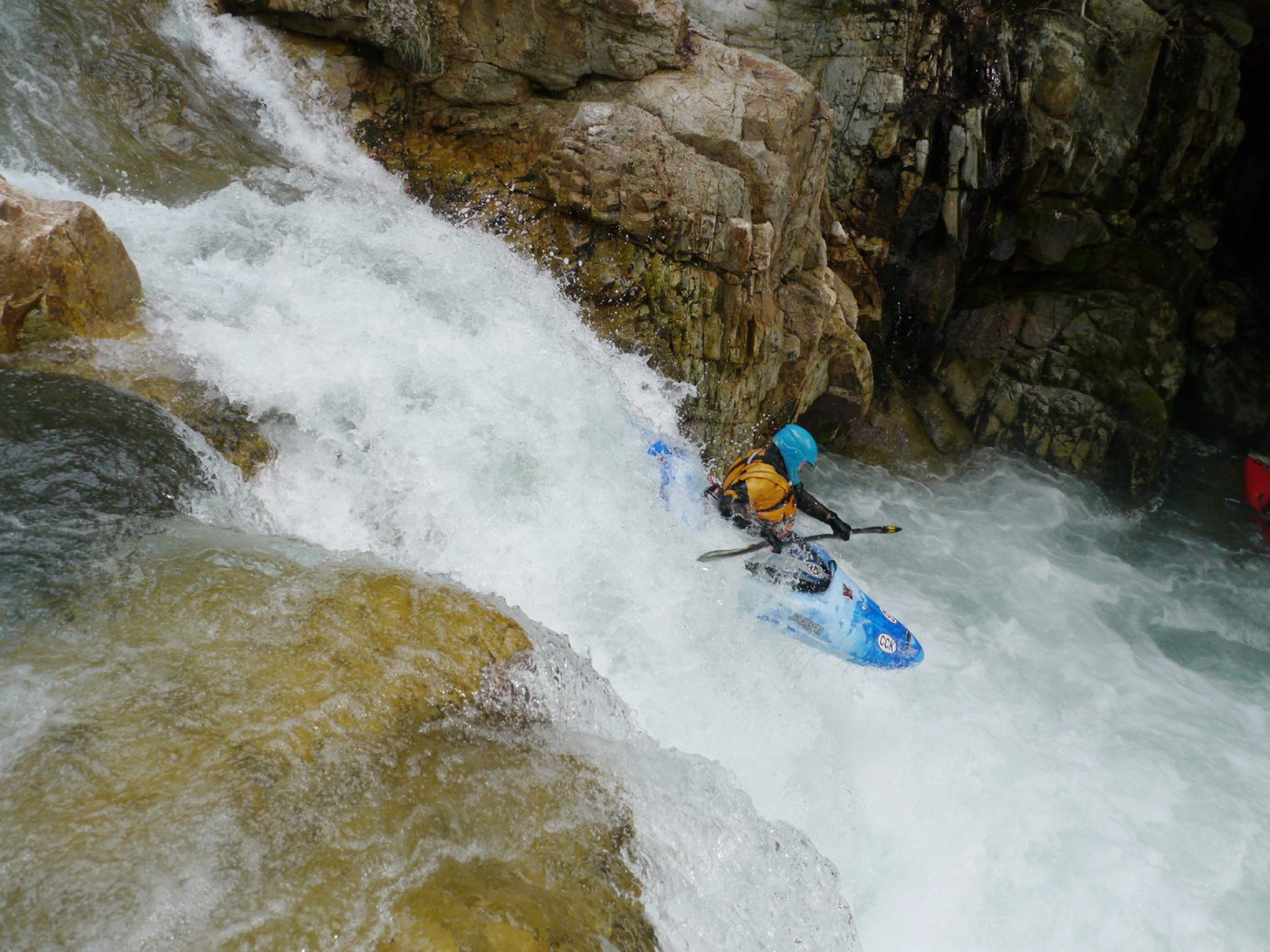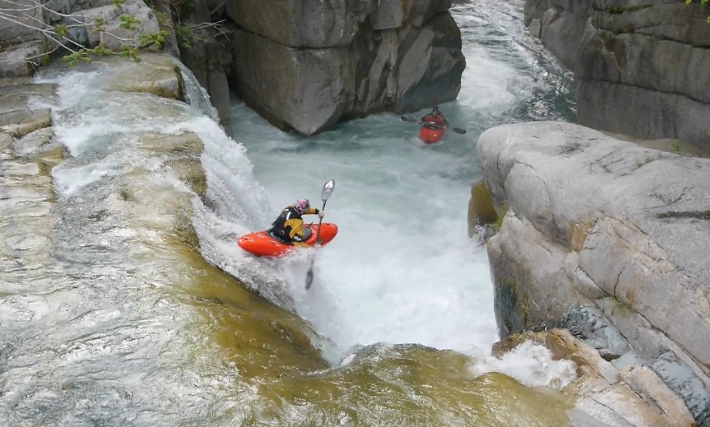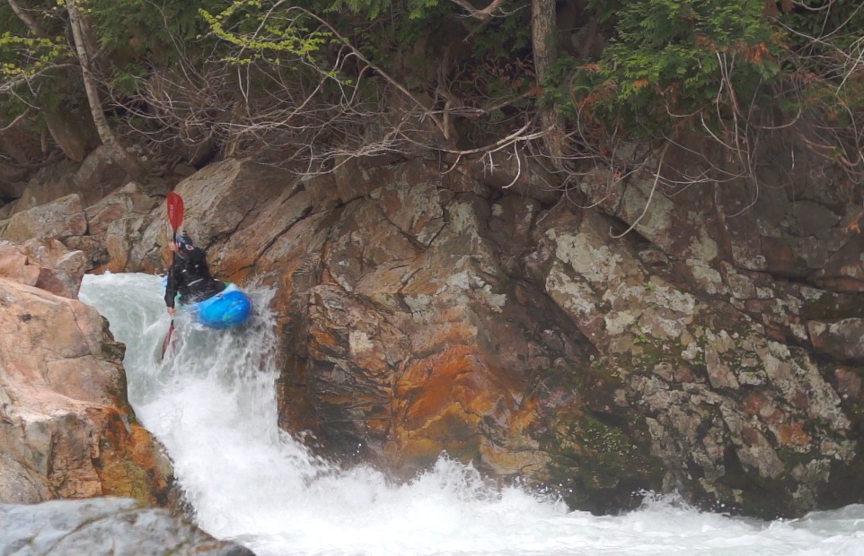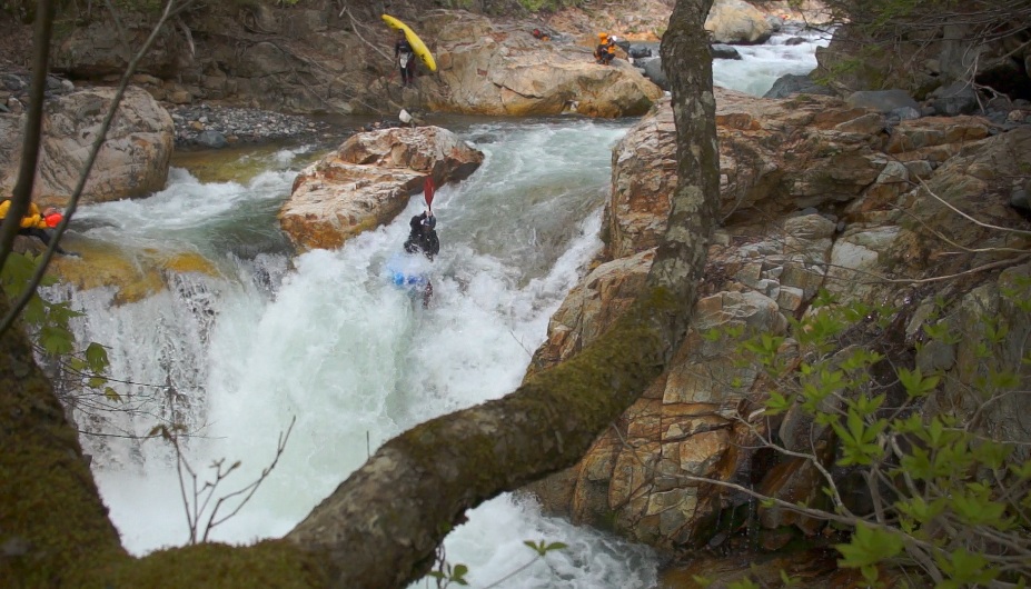 Sliding Falls (IV+ to V). A few holes in the lead in push you right away from the line you want. End in the left channel and boof off the slide and clear of the falls. I have seen video on youtube of Lincoln Taylor running this at really high flows and it looks consequential!