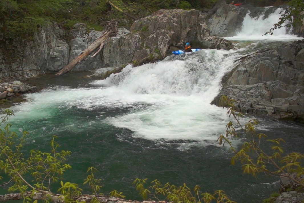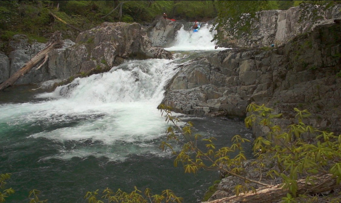 Large Double Drop (IV to V). At the low flows it was straight forward, the first falls is maybe 10-12 feet tall, best run down left of center. Scout from the right. The second drop was just a small pool downriver, best run hard left to right.