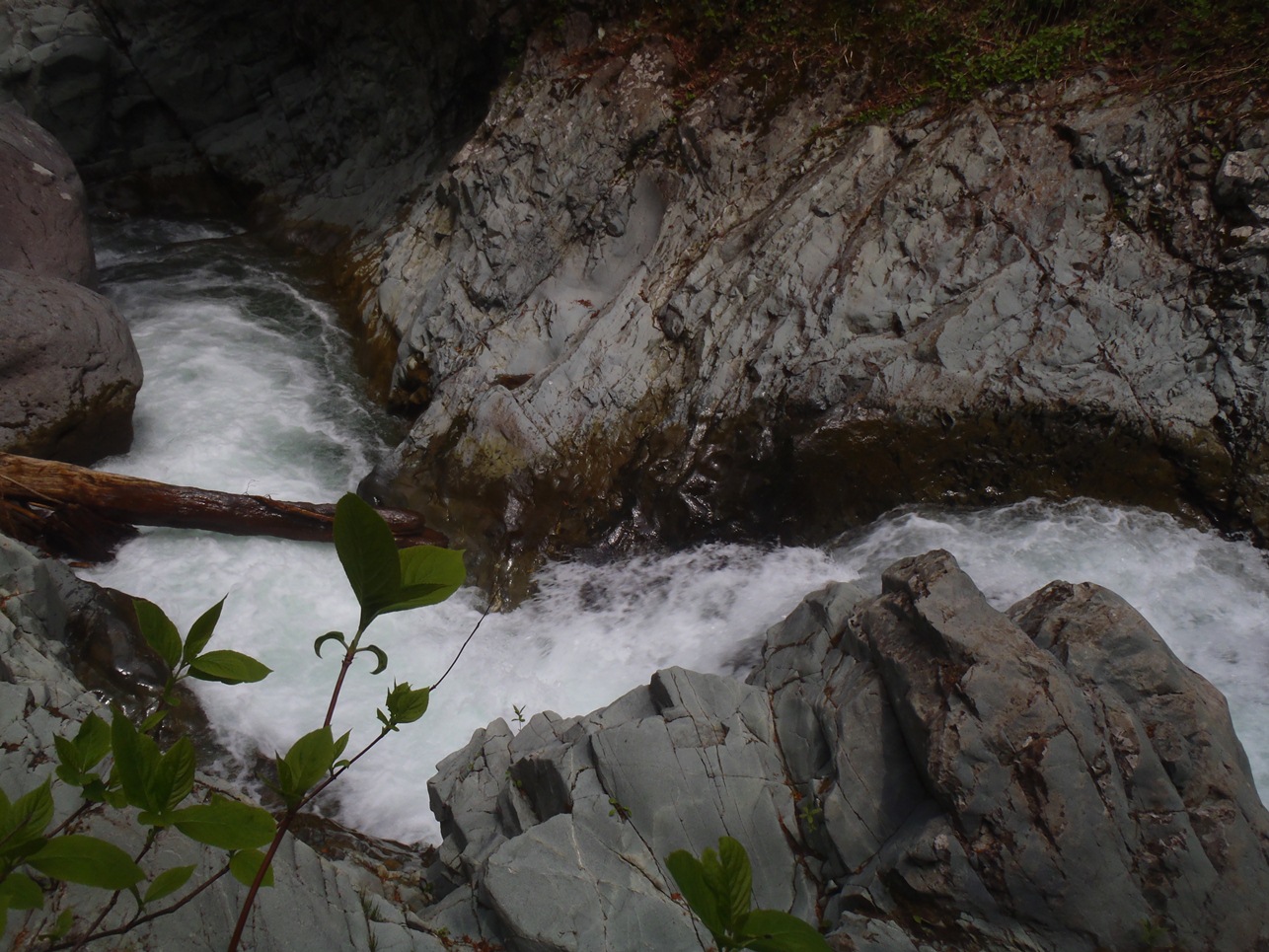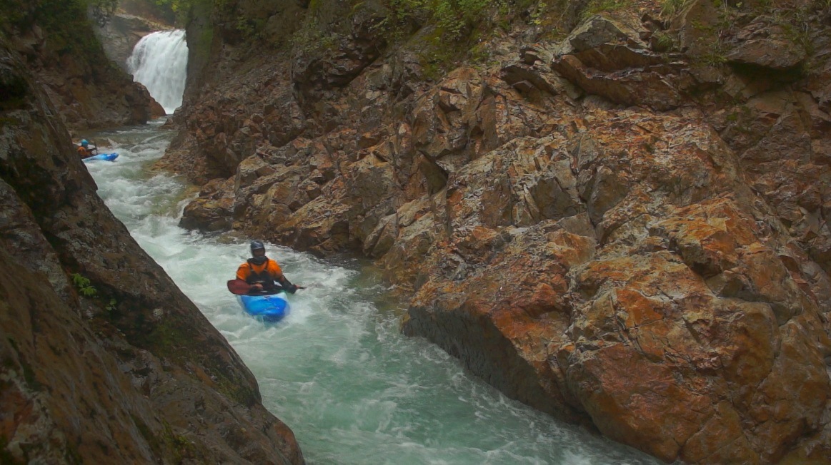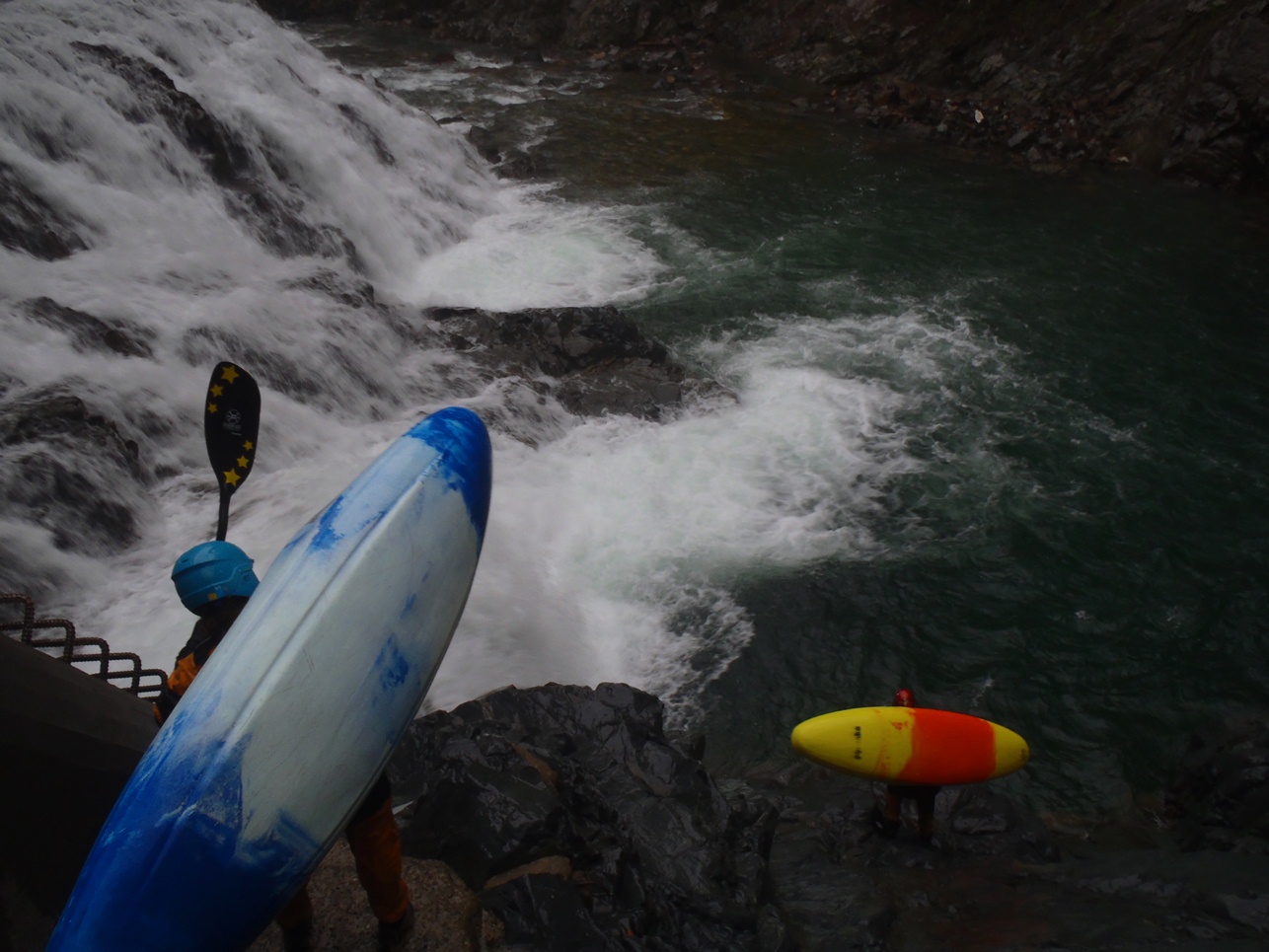 Put-in: Driving up the Zakogawa, you will see a trailhead on the left marked by a blue sign (if I recall correctly), that is the trail to the dam. A quarter mile further on a right bend, there is another turnout on the left with a totem standing. This is the trailhead to the base of the falls. Go left at the fork to in the trail until you find a ravine/creek (the second creek you come to) to drop down with rope assist.