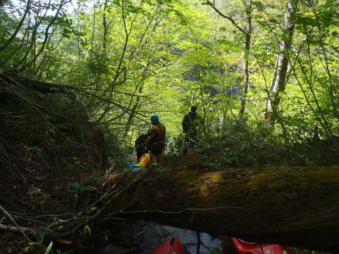 Portage (U). Just downstream, the river dropped into a constricted bedrock rapid that a tree in it. We eddied out easily (though the log isn't all that visible) and portaged on the left.