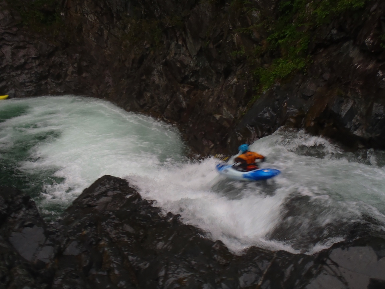 - Waterfall (V+ to P). Go left. At low flow, plug and paddle away. At high flow when the river pushes hard into the undercut (so I have I heard... even low, 1-2 roll attempts is all you get before you are in it) you need to boof hard left. The hazard is the very undercut wall on the right. At the low flow, Rok volunteered to run the waterfall. He tried a center line and got pushed all the way to the right of the undercut and rolled up off the wall before getting pulled into the main undercut. From below, he collected boats as we threw them off the falls (not possible with high water). Then after a few boats styled it down the left, Darin gave it a go to help further... We had one scary moment though when one boat without float bags plugged and had the skirt blow off of it, flushing full of water into the undercut and blocking Rok into it as well. Several scary moments later, and after 3 rolls, Rok was able to fully right himself and back out of the undercut with the boat in tow. Amazing. Luckily, we carabineered our skirts to the boat in case an implosion happened. OK, so now portage talk. Head up the hill to the right, climb up and cross the first gully (just exposed hillside) and then continue going up. We worked left too soon and had to climb up super sketchy spots. There is a ravine that you need to get above and cross. At this point we found what appeared to be some sort of game trail to traverse on before getting to the next small creek ravine that we were able to fairly easily downclimb back to the water. The portage was on very steep slopes, literally at times approaching 70 degrees and it was pouring rain on us (day started sunny!). Luckily, the forest here has roots and vines that are super solid that you are able to use to assist your climb. Without these it would not be possible. Also, I know Lincoln has done the portage with his boat before with assistance... but dang I cannot imagine that. I was stressed just having my paddle in one hand. However, at the high water when he did that... the throw of the boat was not an option. FYI, at low flows, the first descent group that did a throw and go and lost a paddle in the undercut, never to be seen again.