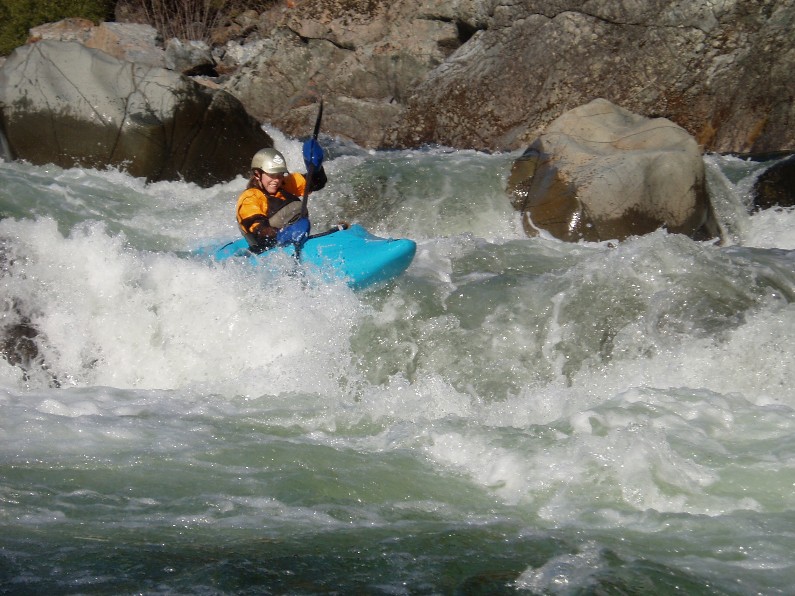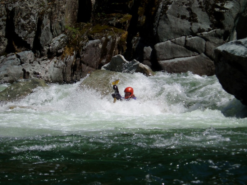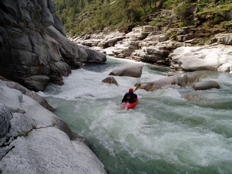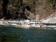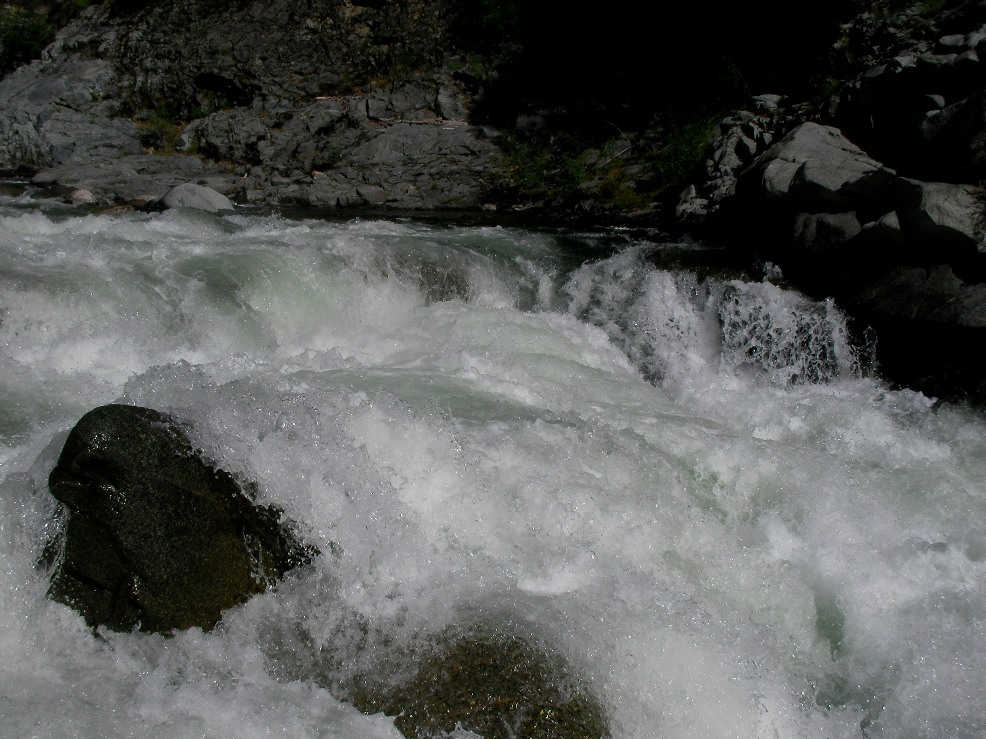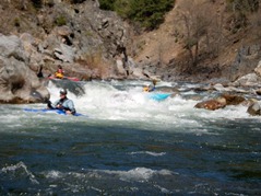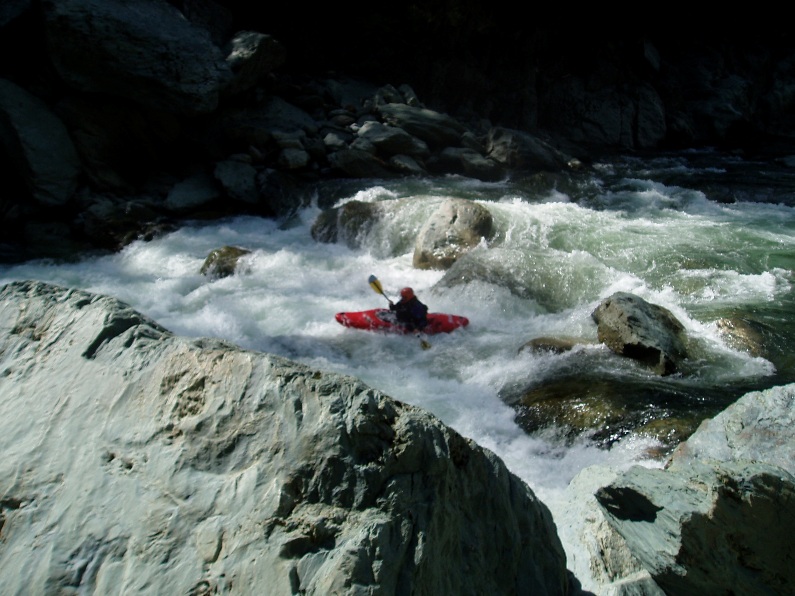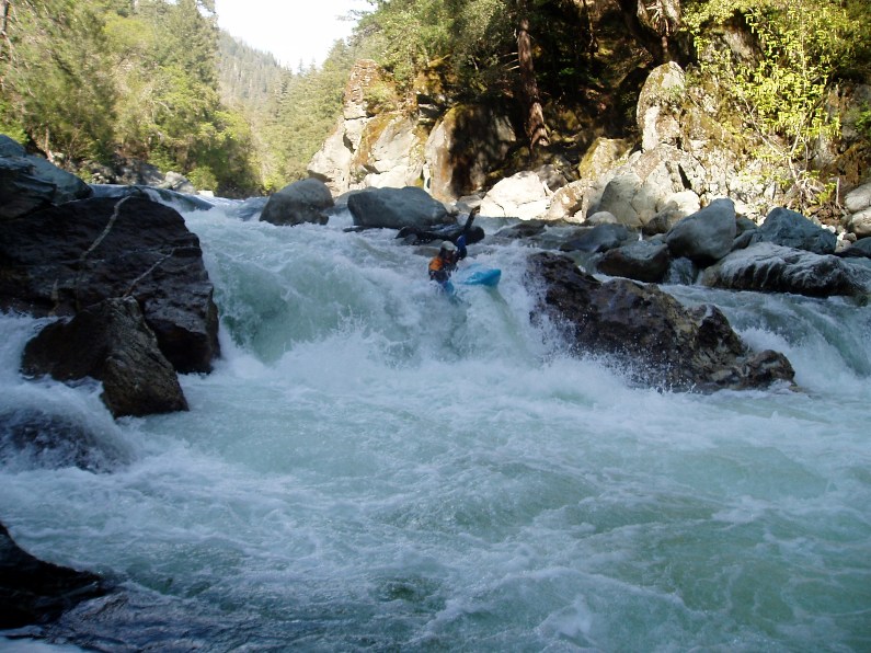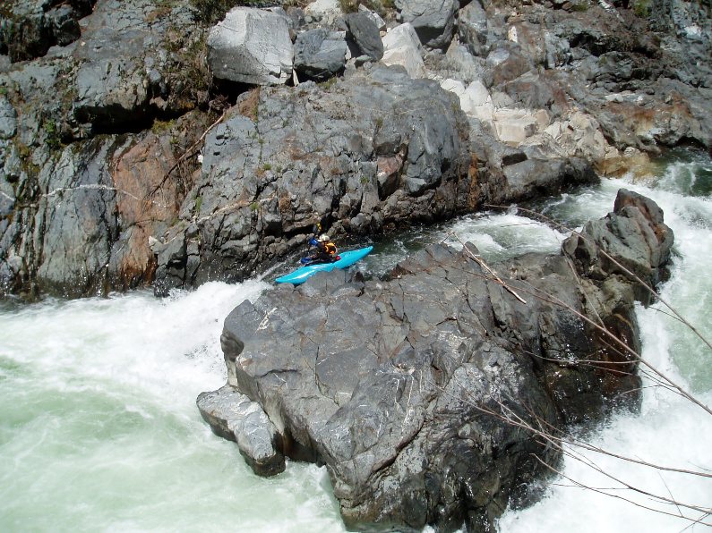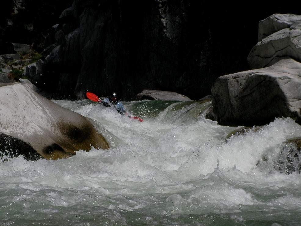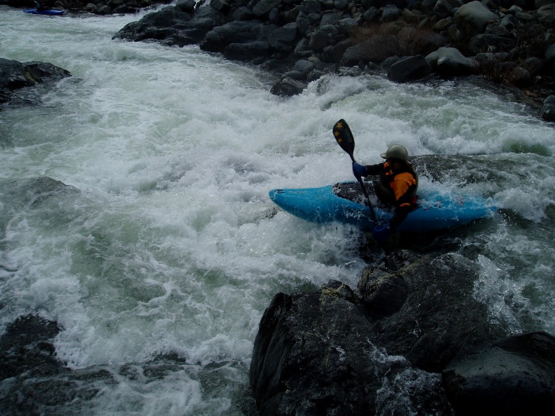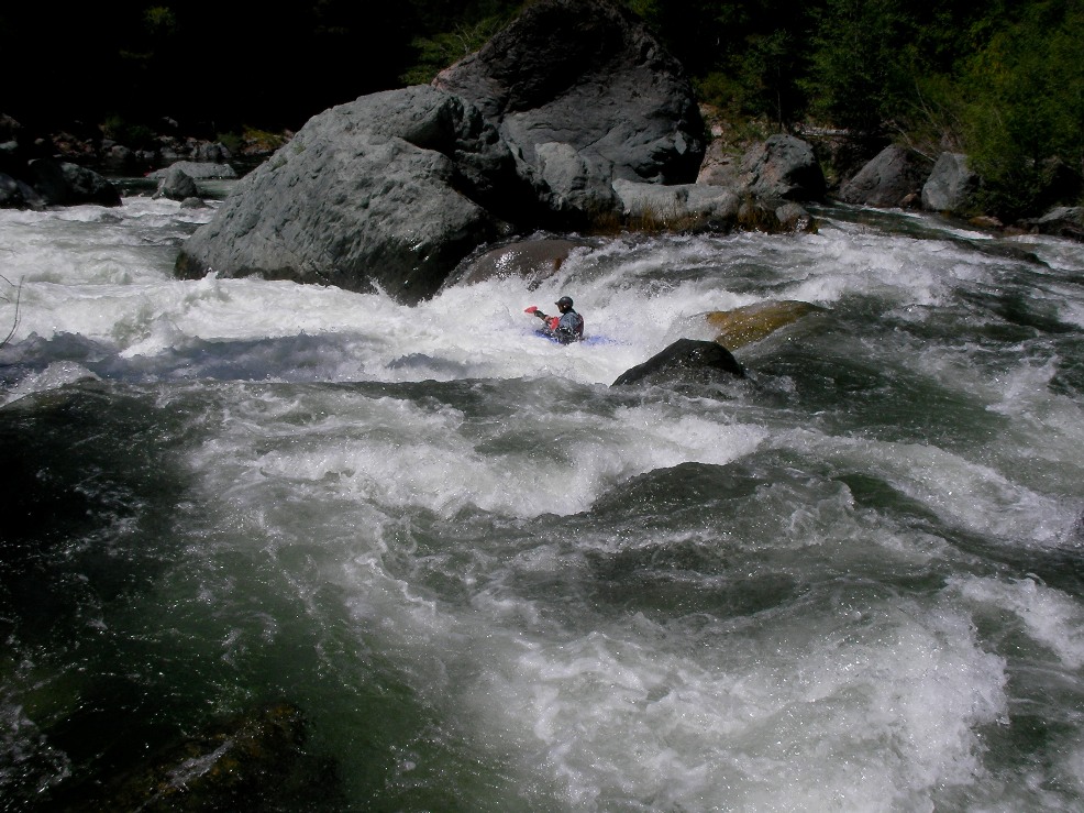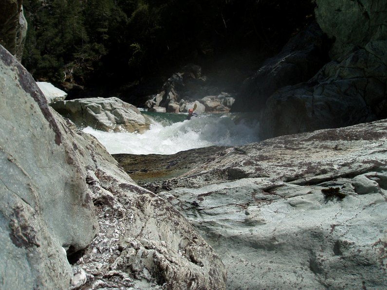 - S-turn (IV+). Just when you think the hard stuff is over, the river drops into another gorge. The entrance is rather blind but Corey probed away. We entered between two large boulders and were blindly greeted by a huge hole backed up by a huge rock, I blasted to the left and down into a few more large holes. Diane went right and had marginal success.
