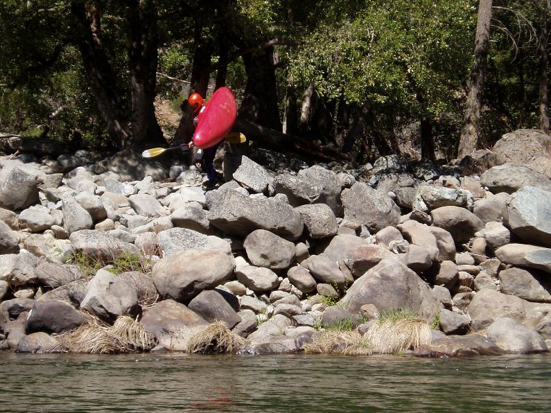 - Before the Portage (V). A huge rapid with 2 large holes at the top before the river splits. The final drop on the right of the split is easy, the left side has a large hole that is also a bit sieved out. Scout or portage on the left. To do a complete portage requires team work up and around the house sized boulders at the bottom.