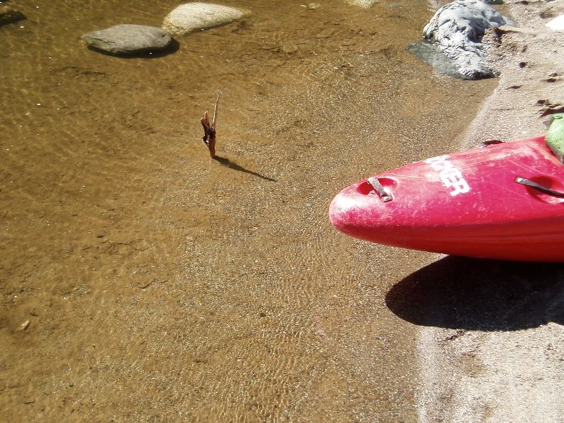 Large Hole (IV). An interesting looking kicker on the left led to a very large hole that none of us had the guts to probe. The center line dropped into a hole, the left of center might clear the hole but also kinda landed on a rock, so we chose to drive right across the top of the drop and drop it near the shore to face smaller holes.