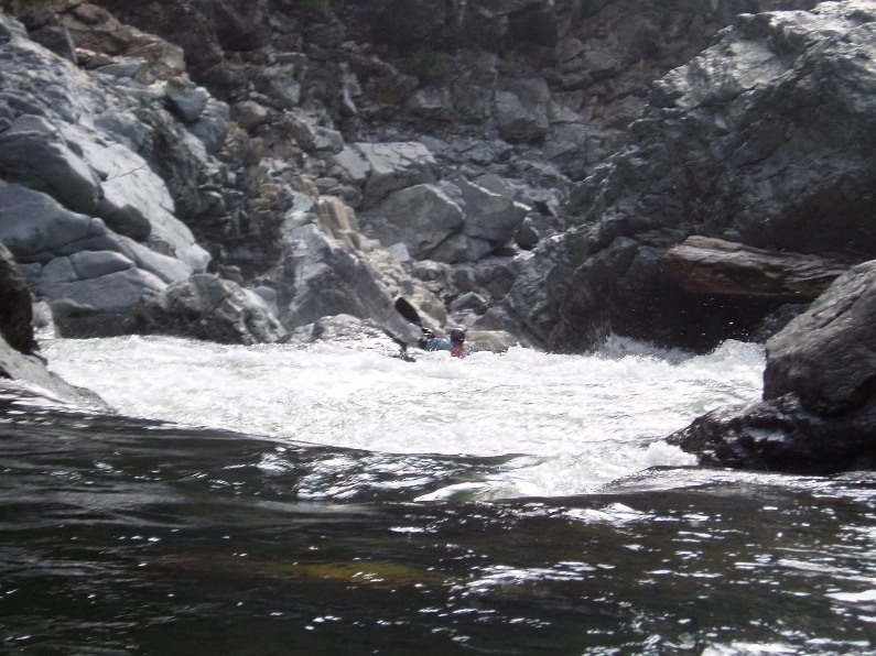 Right or Hole (IV). The river drops off of a large shelf. The line is to drive right onto the cushion forming off the wall, and ride it around the hole. If you don't get enough umph then you will end up in the very large hole in the middle. There also looked to be a boof line on the left 2 feet of the river. This is the top of Devil's Canyon proper.